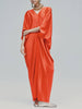 The luxurious silky sheen and flowing silhouette drape gracefully, creating a delicate and feminine look. The belted waist accentuates the figure, while the plunging V-neckline adds a touch of allure. Perfect for evening events, garden parties, or sophisticated casual wear at home.