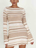 Combining a modern striped pattern with a flattering open back design, this dress offers a chic and sophisticated look.