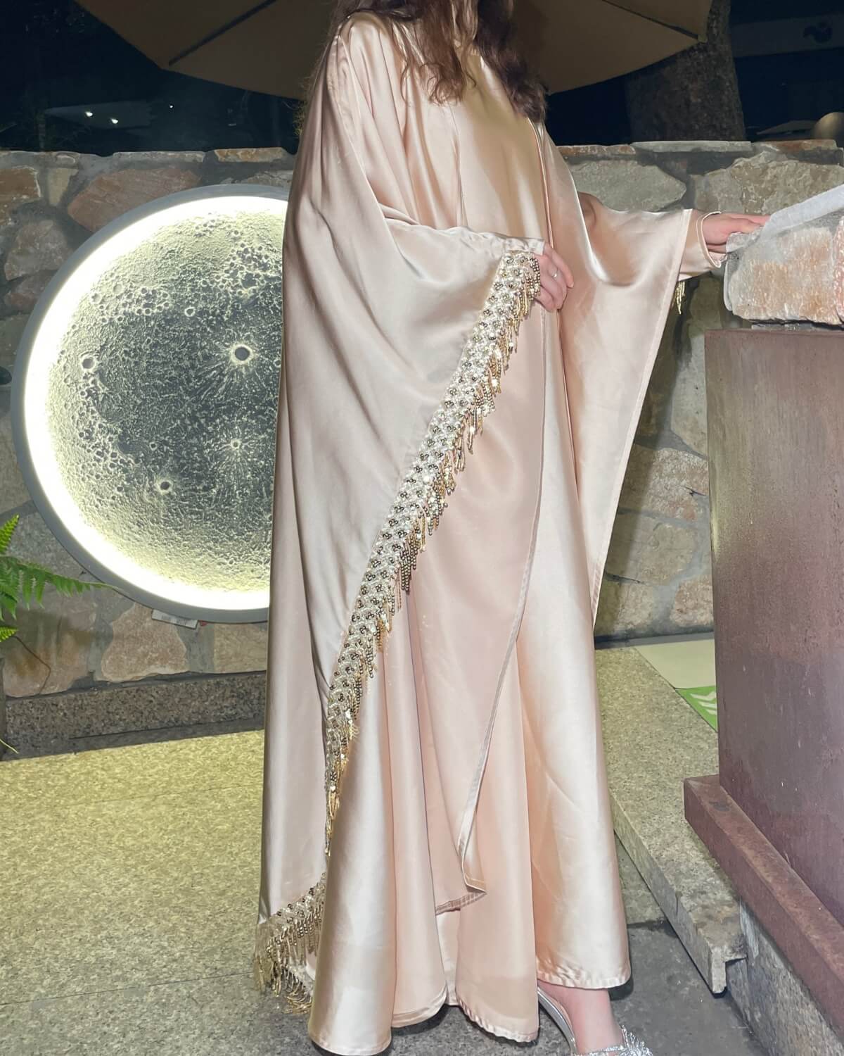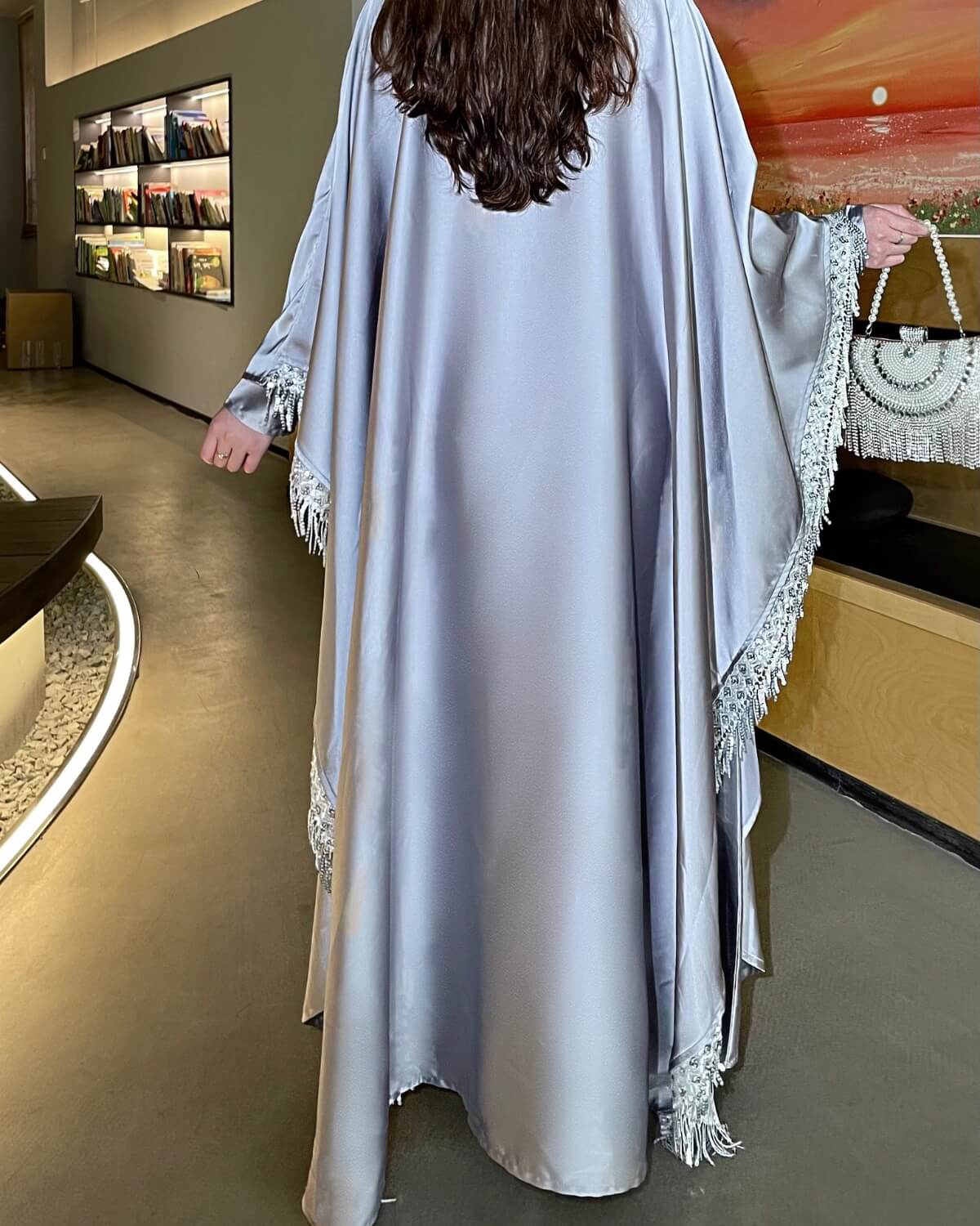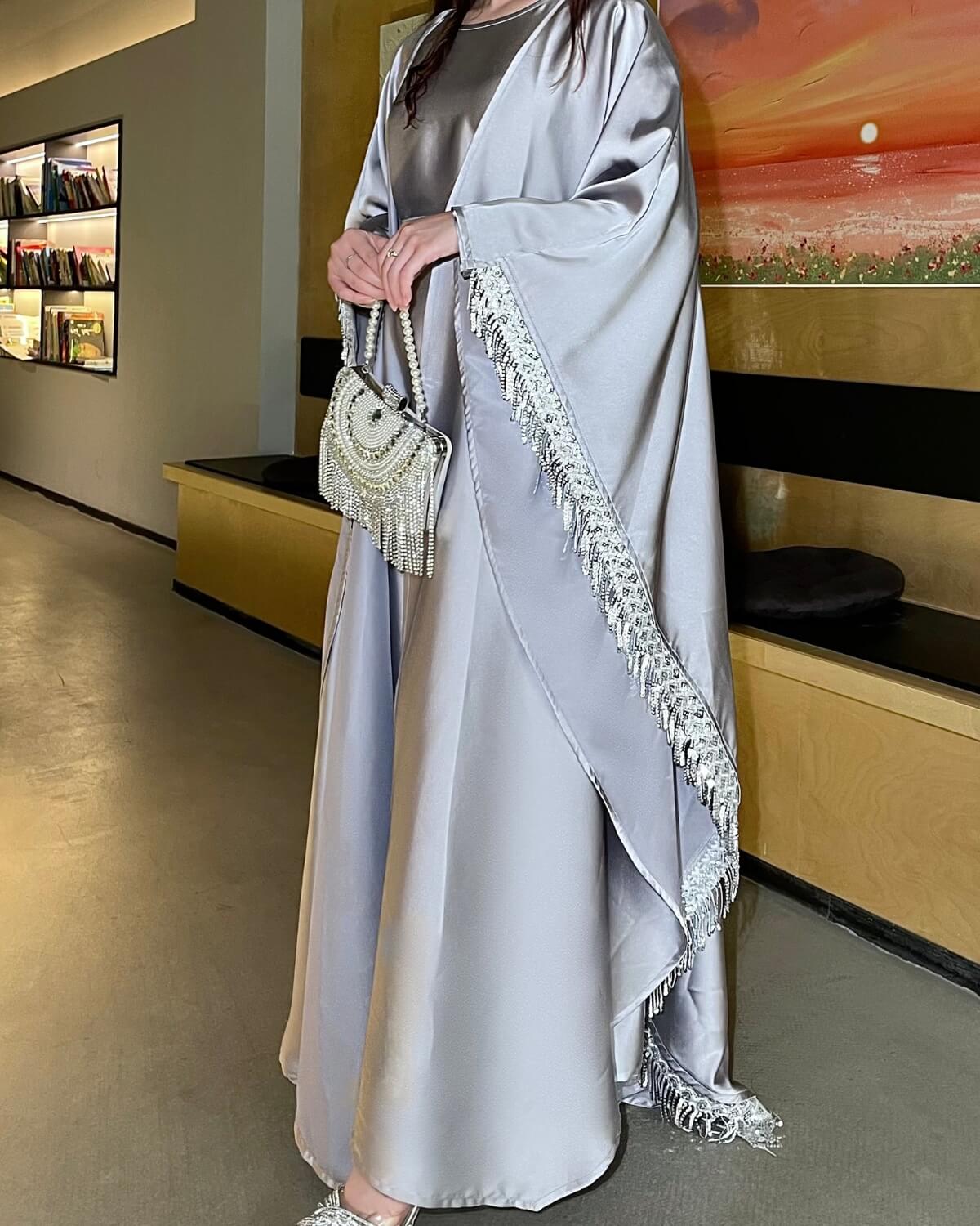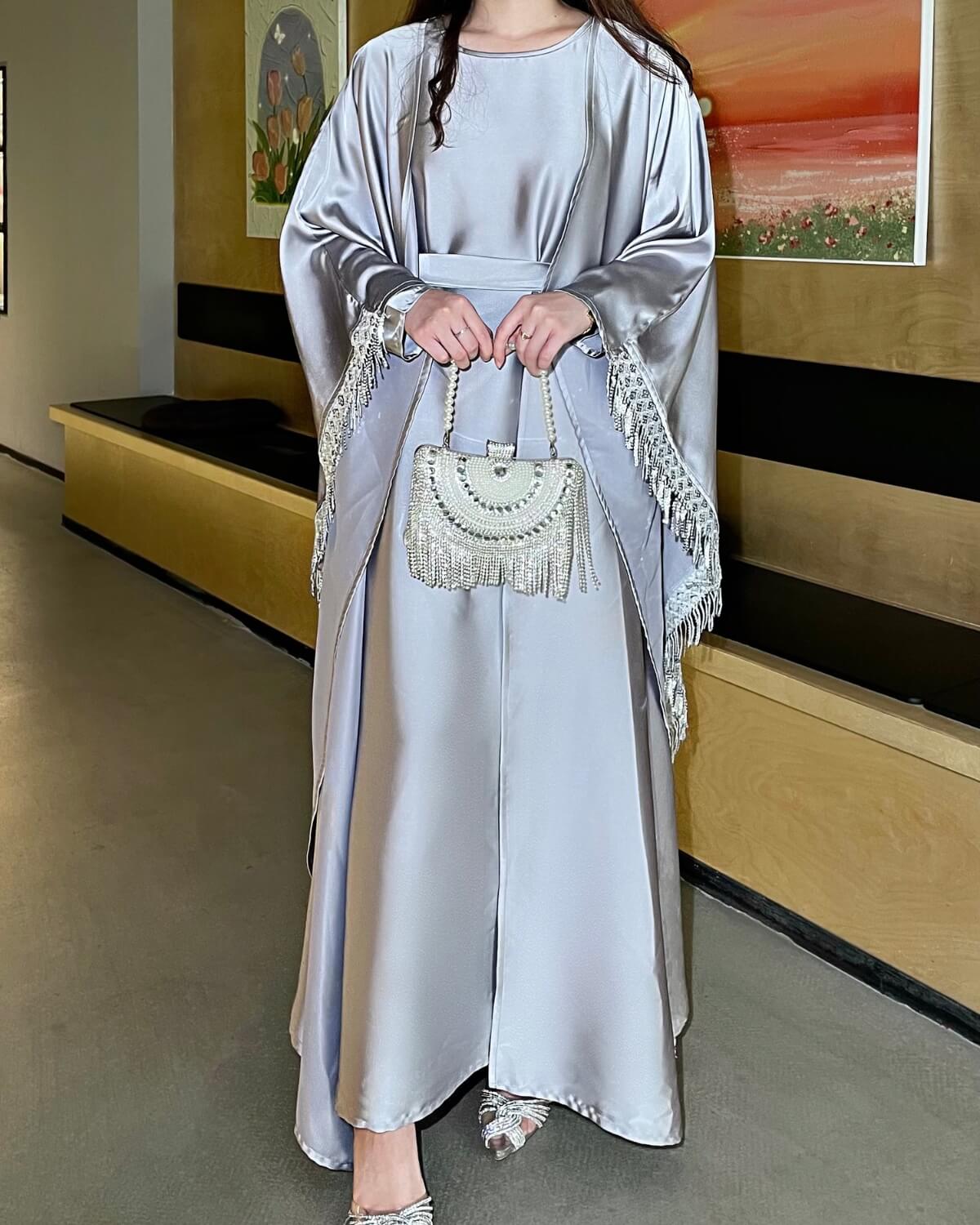 • Style: Premium satin tassel butterfly abaya dress 3‑piece set