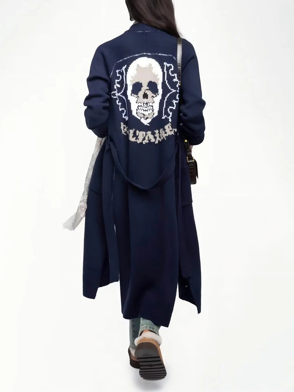 Elevate your casual style with this intarsia skull knit long cardigan. Designed with a relaxed fit and open front, it combines comfort with a bold, edgy vibe. Perfect for layering over tees or dresses, this versatile piece adds a unique statement to your everyday wardrobe.