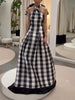 Add a touch of timeless style to your wardrobe with our Classic Plaid Printed Halter Maxi Dress.
