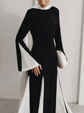 Make a stunning entrance with this elegant contrast panel maxi dress, designed to turn heads at any party or special occasion. Featuring sleek color-block insert details that accentuate the silhouette, this dress blends sophistication with modern flair. The flowing maxi length adds graceful movement, while the tailored fit ensures timeless elegance. Perfect for evening events, weddings, or formal gatherings.