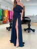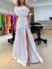 Bold and elegant, this slash neck maxi dress features a striking asymmetrical neckline and a daring thigh-high slit. With its flowing silhouette and sophisticated details, it is sure to leave an unforgettable impression.