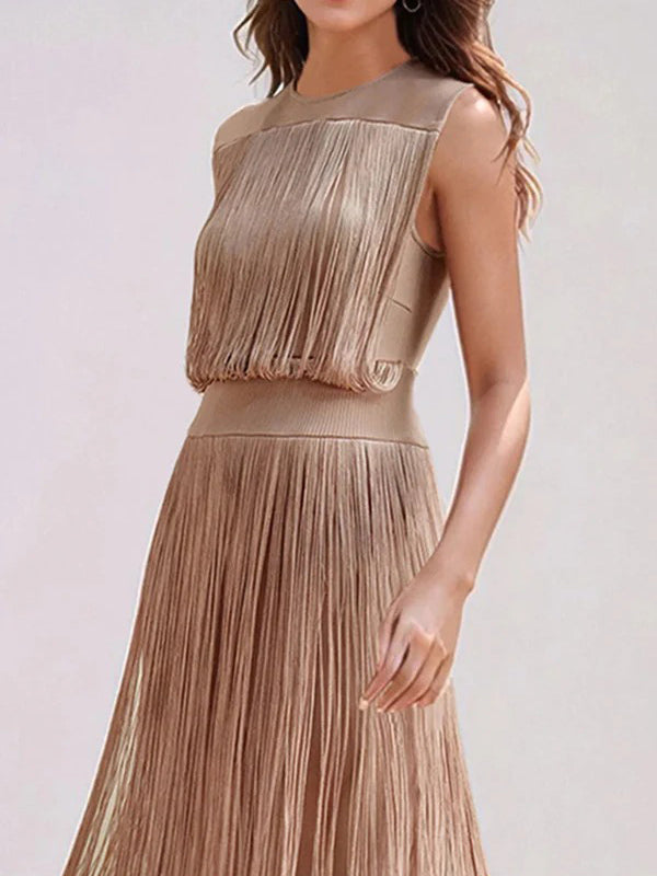 Elegant sleeveless high-waist slim tassel midi dress, featuring a figure-flattering silhouette and delicate tassel detailing, perfect for cocktail parties or summer soirées when paired with strappy heels and a chic clutch.