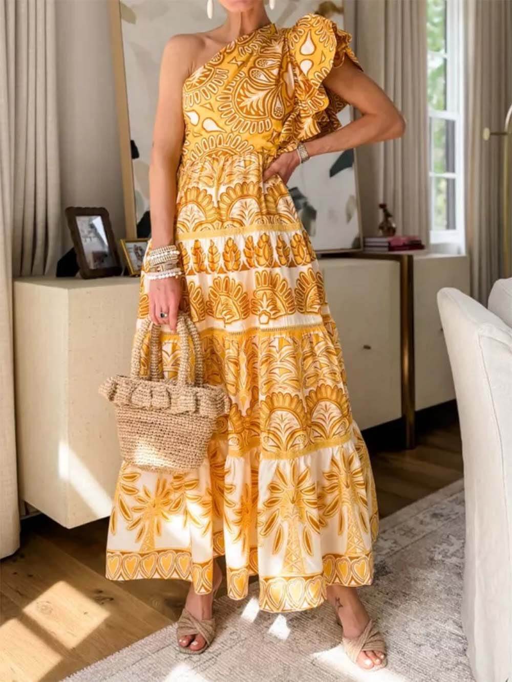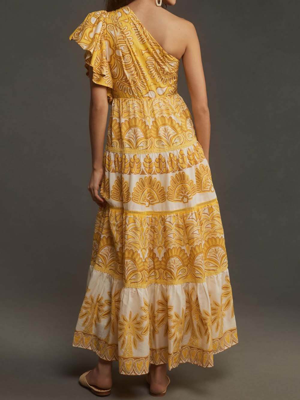 Exquisite Unique Print One Shoulder Ruffle Sleeve Tiered Maxi Dress