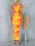 Mesh Overlay Printed One Shoulder Ruched Stretch Maxi Dress