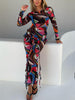 Retro Abstract Print Ruffled Mesh Slim Maxi Dress
