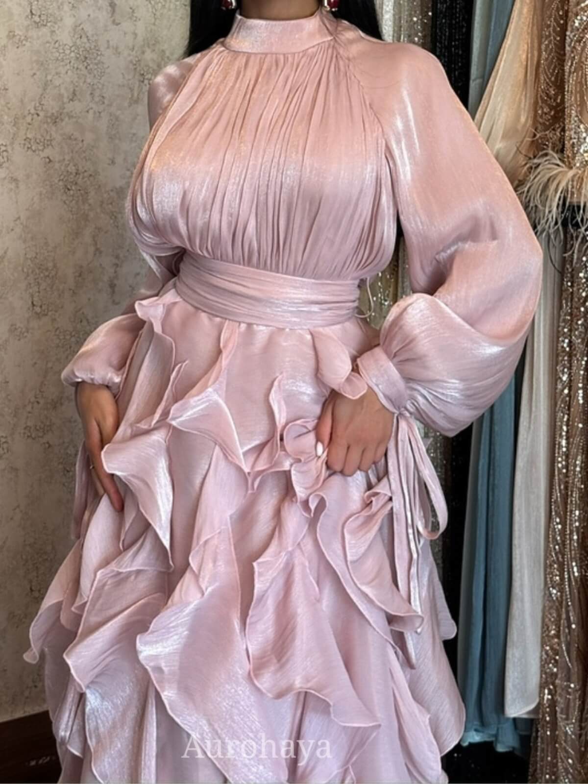 Satin ruffle maxi dress with a high collar and romantic lantern sleeves — a solid-color, retro-elegant gown designed for weddings, bridesmaids, formal evenings and upscale cocktail events. This floor-length dress features a multi-layered ruffled skirt with satin-gloss finish that flows beautifully when you move, a waist-defining silhouette that flatters curves, and vintage court-inspired details updated for modern elegance.