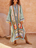 A unique kaftan maxi dress adorned with vibrant floral prints, designed in a flowing silhouette for effortless elegance. Its relaxed fit and airy fabric ensure comfort while exuding bohemian charm, perfect for vacations, beach getaways, or chic daytime occasions.