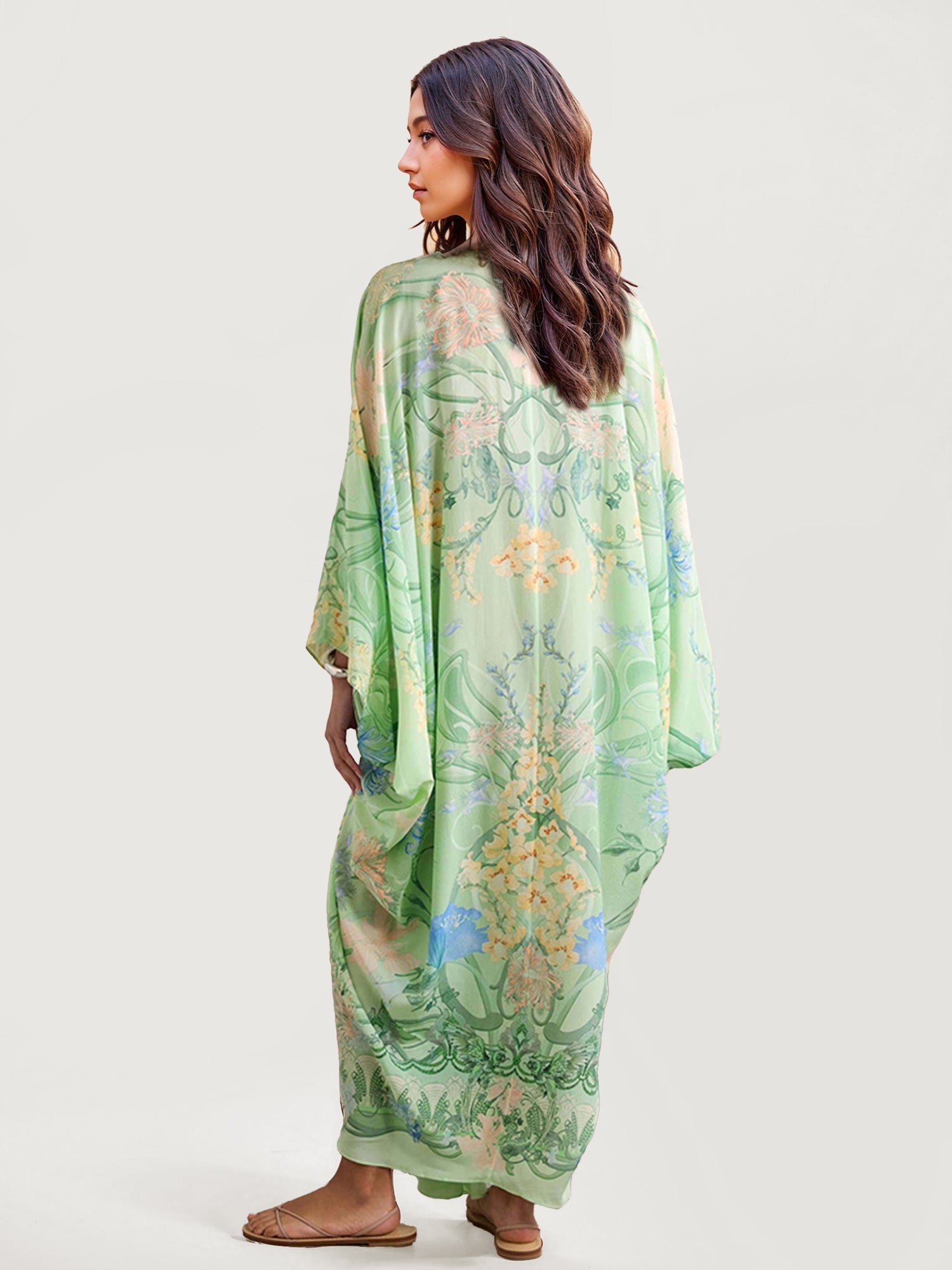 Get tropical in this unique Aurohaya® floral print V-neck maxi midi dress. The loose silhouette and dropped shoulders provide ultimate comfort, perfect for a casual day out or beach vacation. Wear with sandals and a sunhat for an effortlessly chic look.