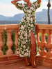 V-Neck Short-Sleeved Slit Printed Midi Dress