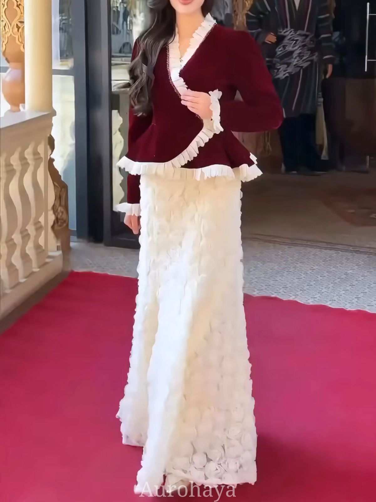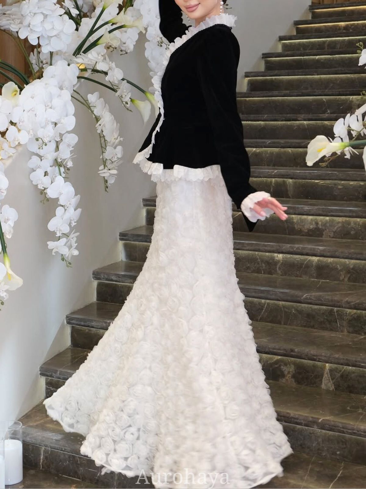Velvet ruffle evening dress set featuring a tailored peplum velvet blazer and a full-length floral mermaid skirt — a luxury two-piece evening gown perfect for wedding guests, bridal receptions, galas, and formal events. The fitted velvet jacket has delicate ruffle trim along the neckline, cuffs and hem for a refined, feminine silhouette, while the sculpted mermaid skirt is textured with 3D floral appliqués for movement and depth.