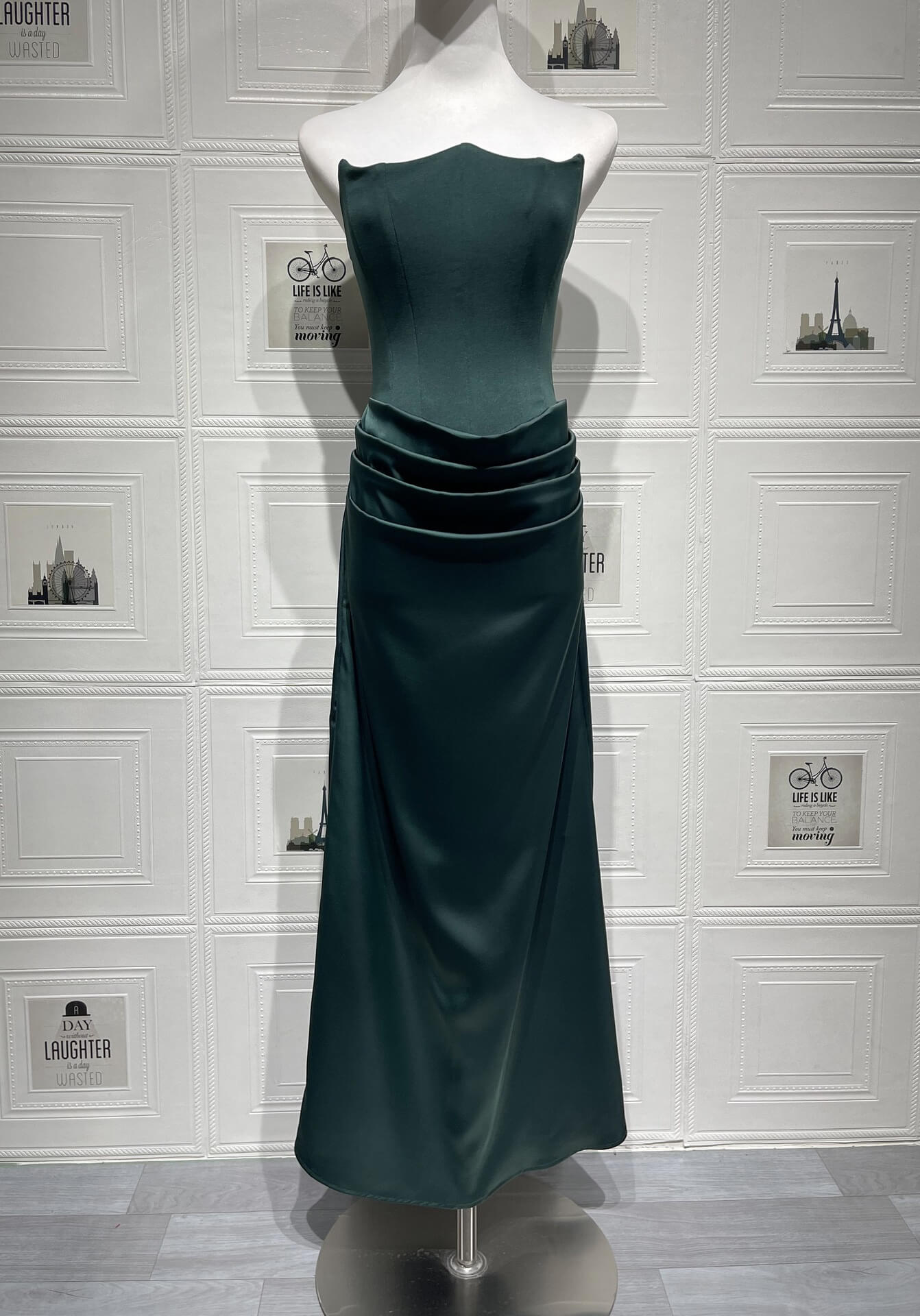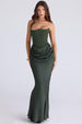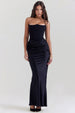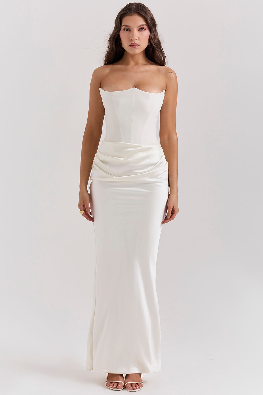 Vianne Satin Off-Shoulder Bodycon Maxi Dress designed to accentuate curves with a sleek, sculpted silhouette. Featuring a structured fishbone corset bodice, this off-shoulder satin dress offers supportive shaping while enhancing the waist and bust. The elegant pleated detailing at the hip adds dimension and softness, creating a flattering contrast to the fitted bodycon design.