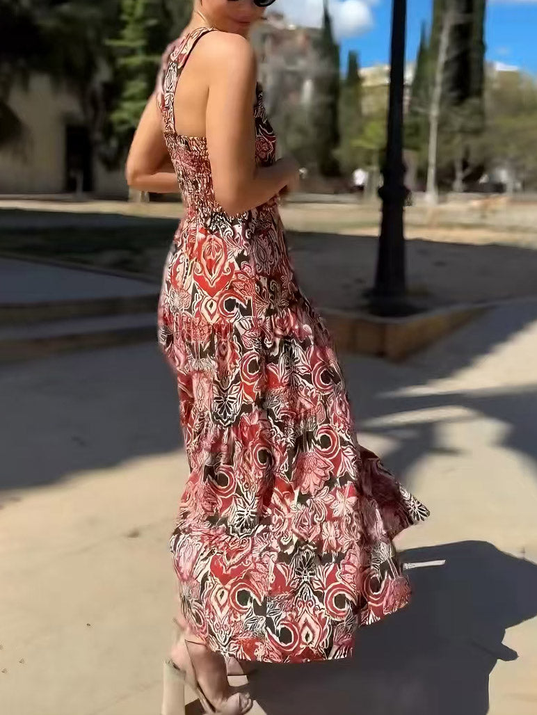 This vintage ethnic print tiered midi dress exudes timeless elegance.
