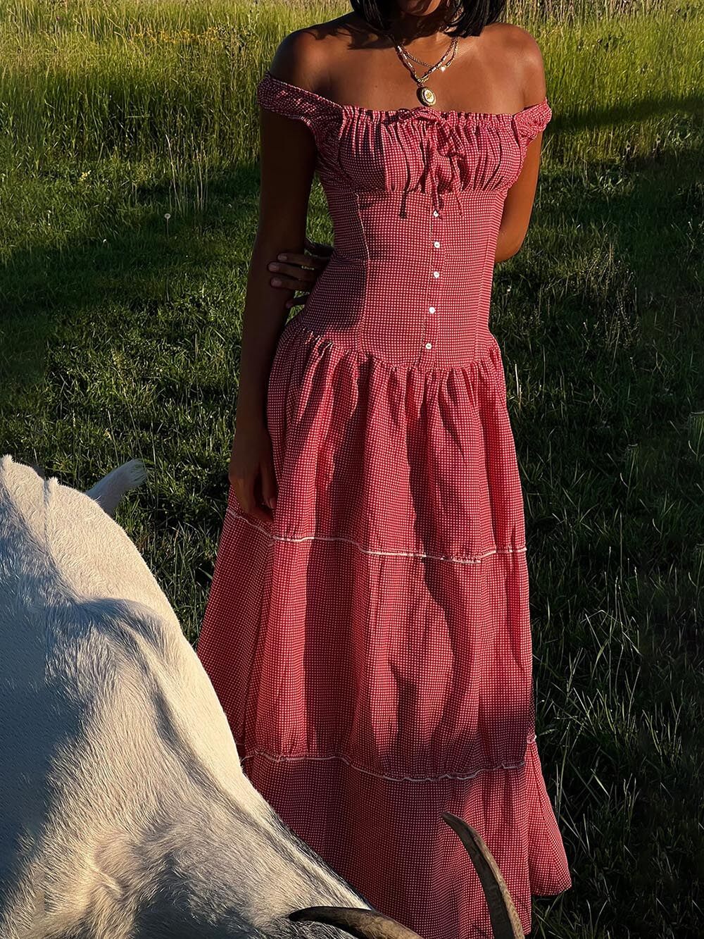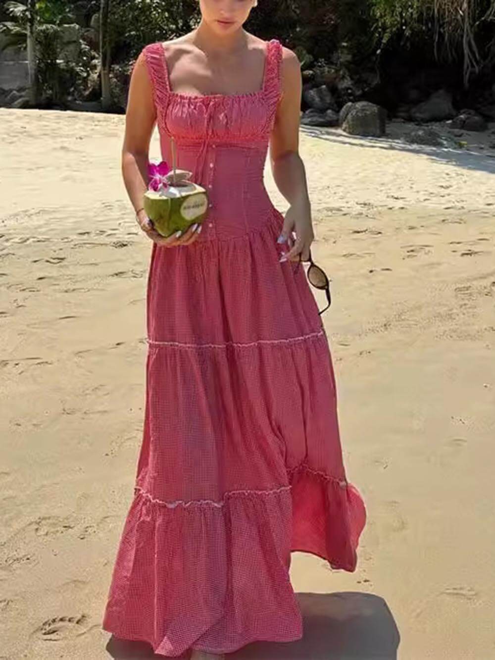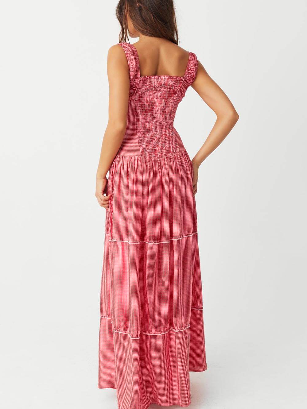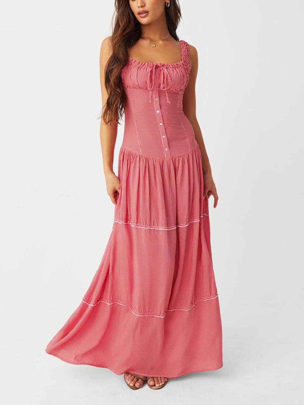 Be stylish and comfortable in our Vintage French Check Print Suspender Drawstring Pleated Ruffle Maxi Dress.