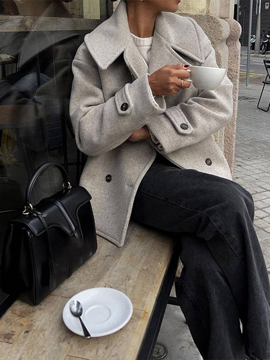 This women’s oversized double-breasted peacoat combines elegant style and casual comfort, making it a perfect outerwear choice for fall and winter. Crafted from durable polyester, this coat provides excellent warmth, long-lasting wear, and easy maintenance. Featuring a classic notched collar, long sleeves, and a loose, oversized fit, it effortlessly blends modern fashion trends with everyday practicality. The addition of functional pockets enhances convenience while maintaining a stylish appearance.