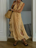 This elegant maxi dress features a flattering V-neck and cascading ruffle trims, adding a touch of romantic movement to the silhouette.