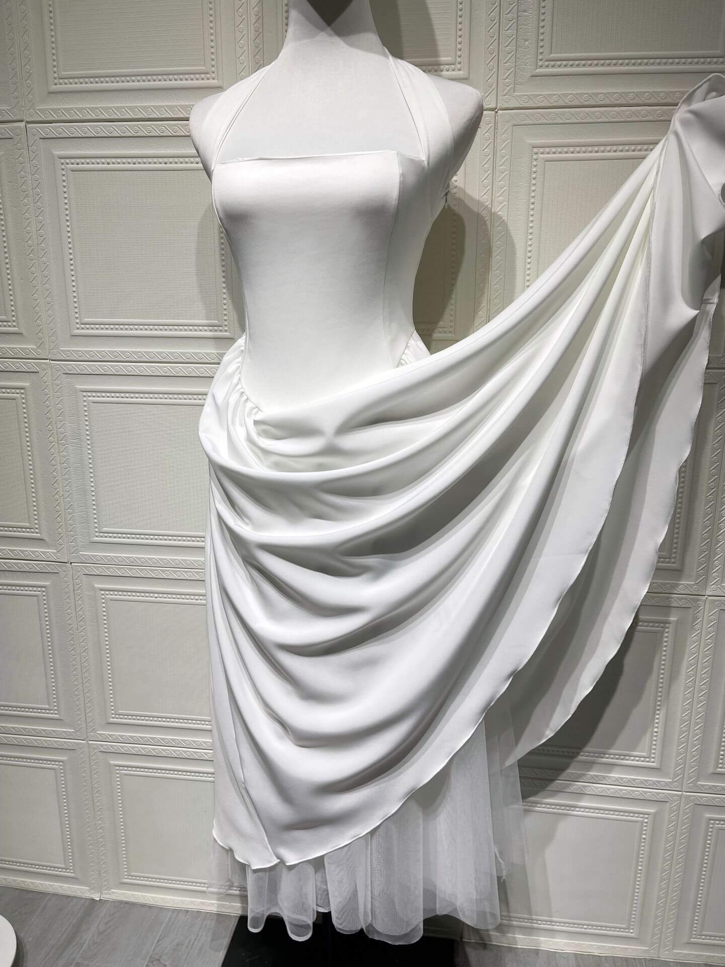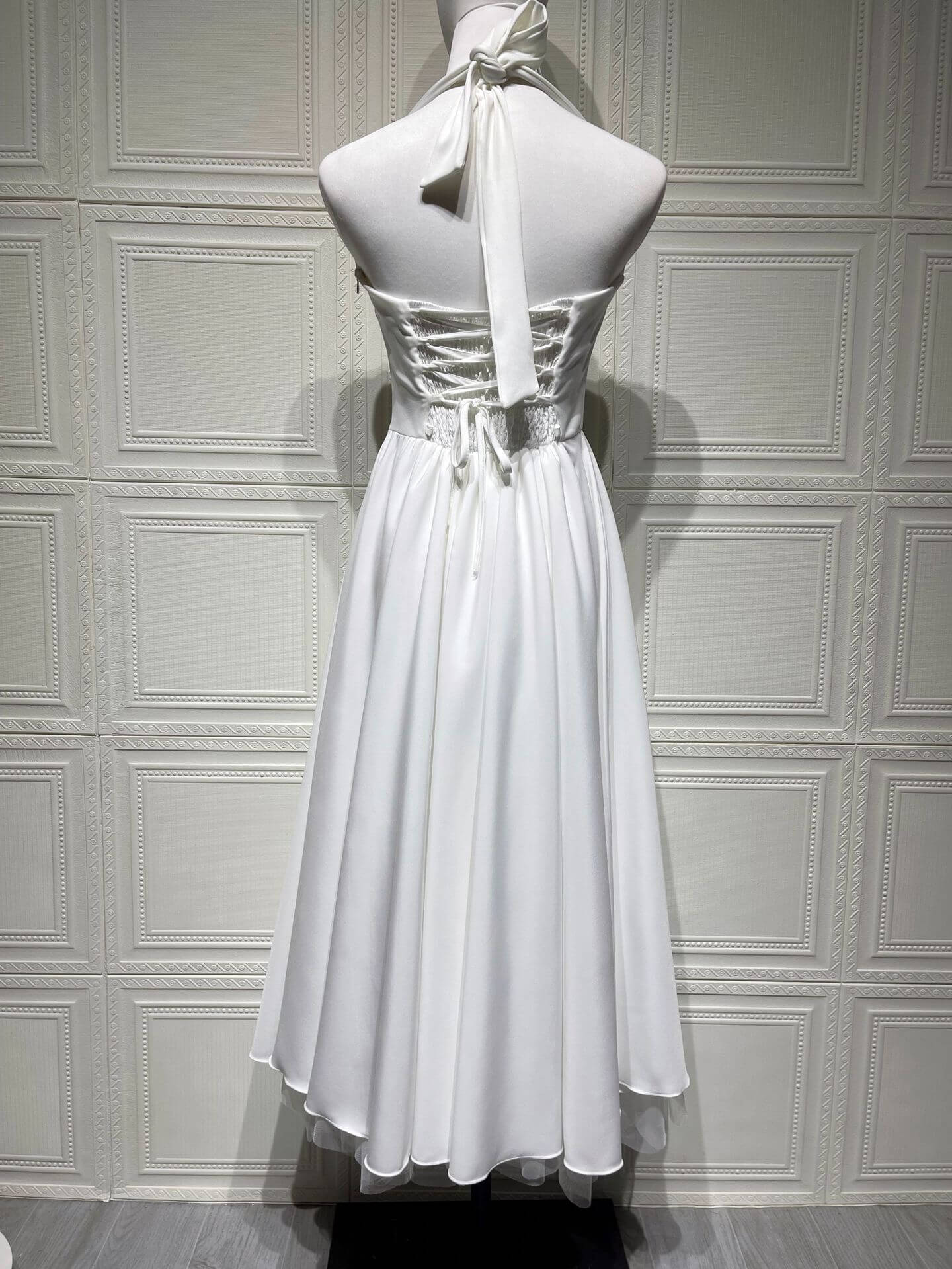 Crafted from lightweight layered tulle, this midi-length dress delivers airy volume without heaviness. The cinched waist enhances natural curves, while the flared skirt adds graceful elegance with every step. Ideal as a white halter dress for weddings, engagement parties, bridal showers, or formal celebrations, this piece balances classic charm with modern minimalism.