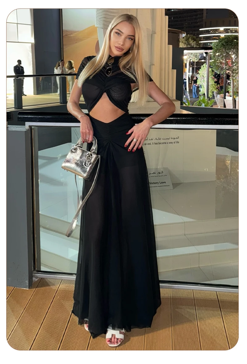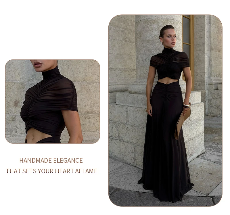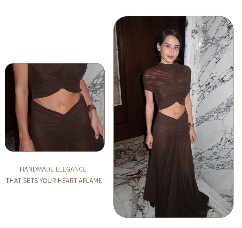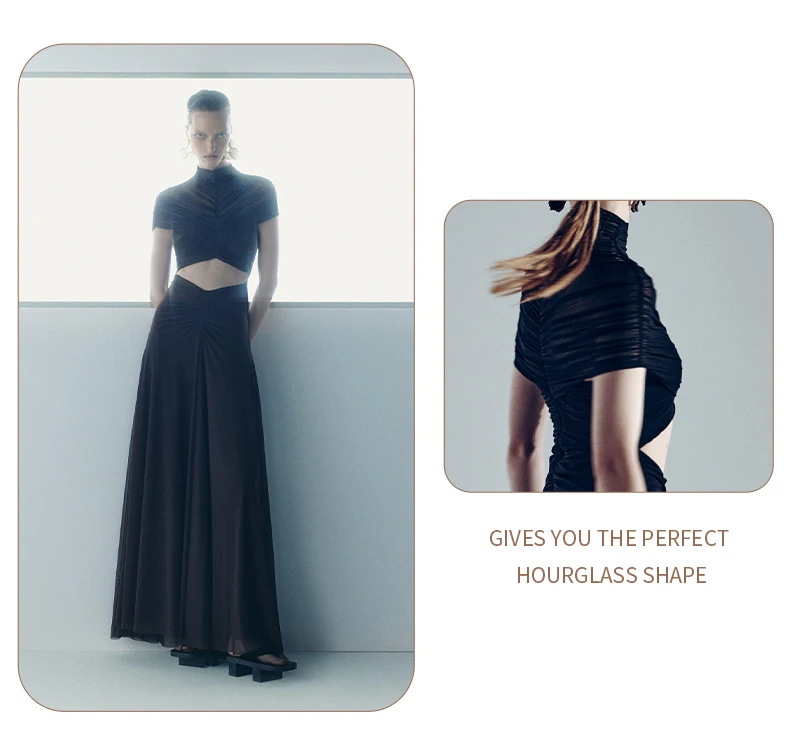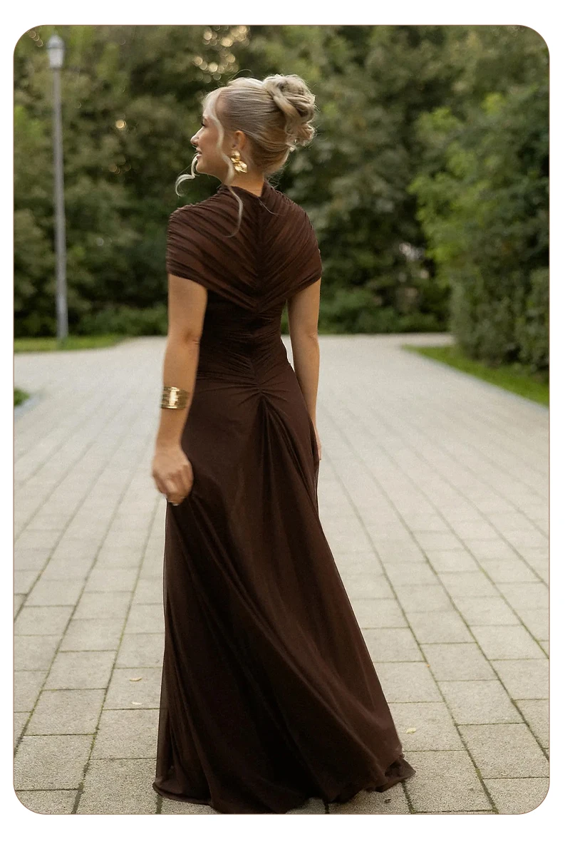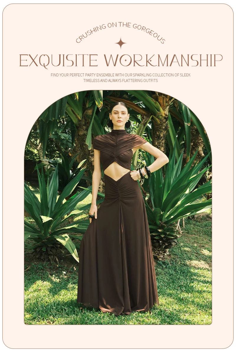The unique hollow-out design provides a modern, daring edge while the flowy, floor-length skirt maintains a classic sense of grace. Crafted from premium, fluid fabric, it ensures a comfortable yet figure-flattering fit that accentuates your natural curves. Whether you are attending a glamorous cocktail party or a formal evening event, the Joséphine dress promises a lasting impression with its rich earthy tone and high-fashion pleated texture.