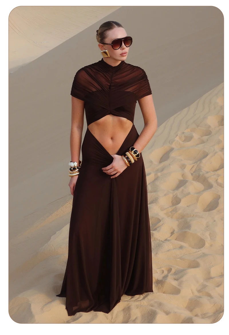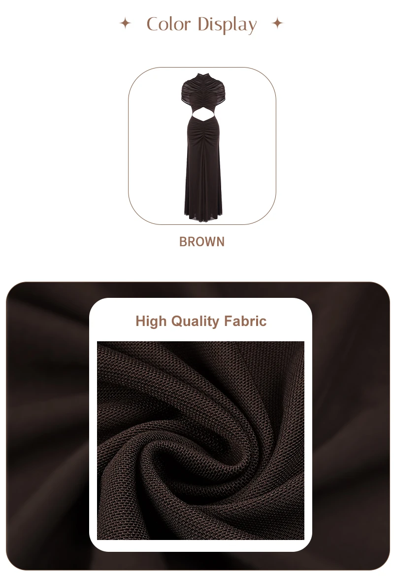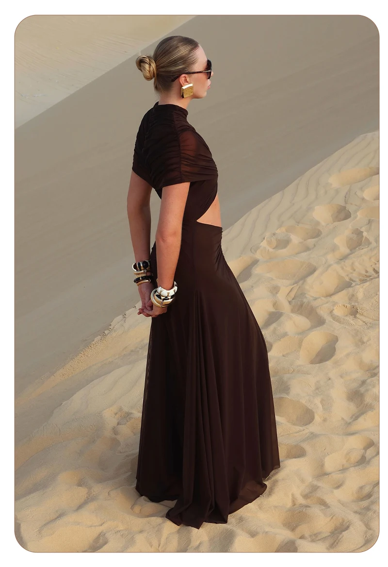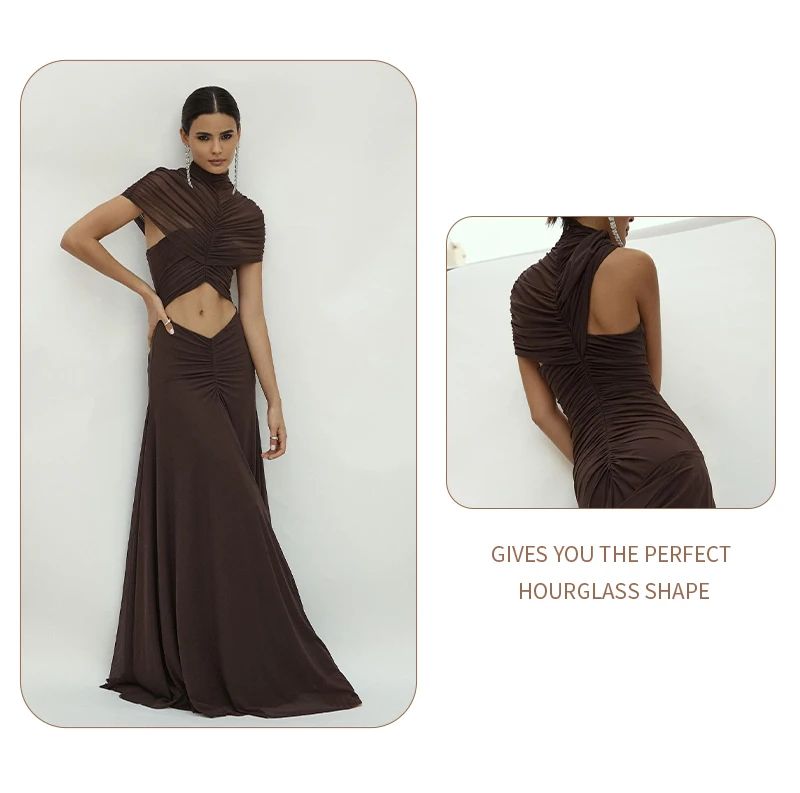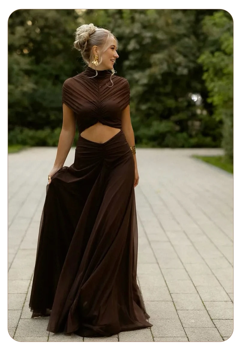 Make a sophisticated statement with the Joséphine Hollow Out Maxi Dress, a perfect blend of avant-garde design and timeless elegance. This chocolate brown evening gown features a striking cutout waist and intricate ruched detailing that creates a beautifully textured, draped silhouette. Designed with a chic mock neck and a sophisticated sleeveless cut, this brown maxi dress is the ultimate choice for formal galas, luxury weddings, or upscale vacation dinners.