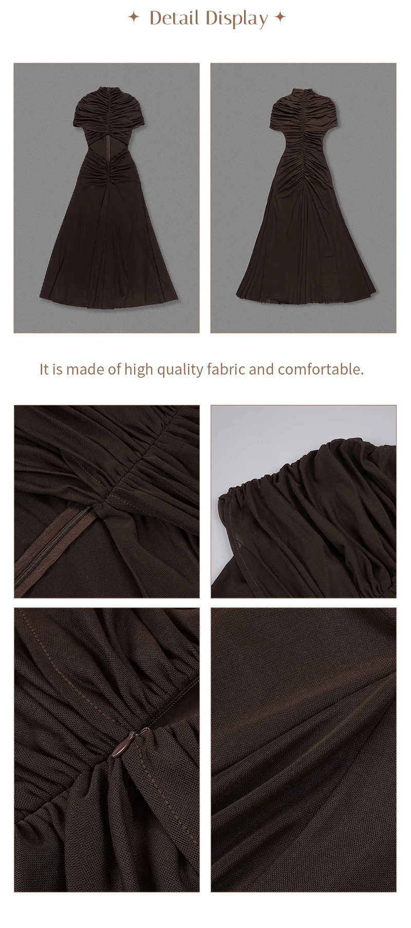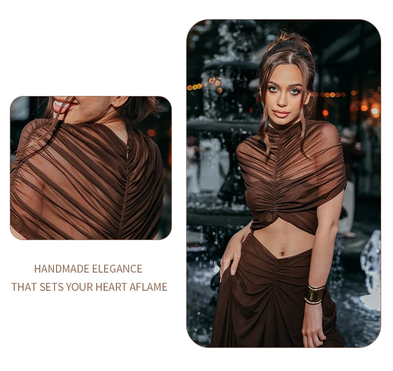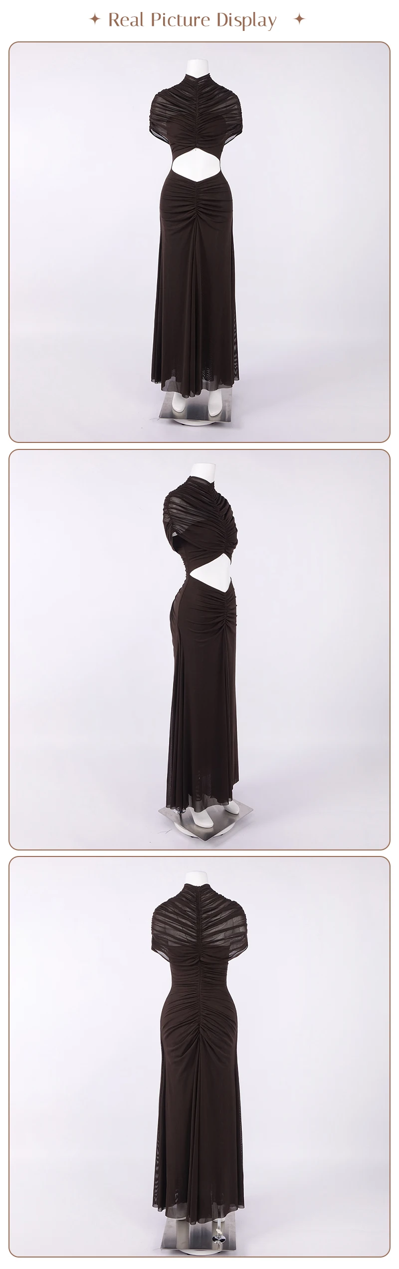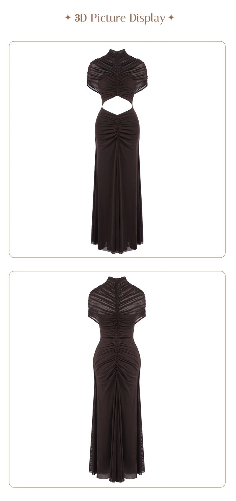 Make a sophisticated statement with the Joséphine Hollow Out Maxi Dress, a perfect blend of avant-garde design and timeless elegance. This chocolate brown evening gown features a striking cutout waist and intricate ruched detailing that creates a beautifully textured, draped silhouette. Designed with a chic mock neck and a sophisticated sleeveless cut, this brown maxi dress is the ultimate choice for formal galas, luxury weddings, or upscale vacation dinners.
