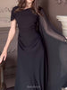 Pleated Asymmetrical Neck Cinched Waist Evening Dress, DES115