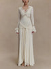 Alluring and elegant, this maxi dress features delicate lace panels that subtly reveal and enhance the silhouette. The flowing trumpet sleeves add a romantic, dramatic flair, while the floor-length design creates a captivating presence for evening events or special occasions.