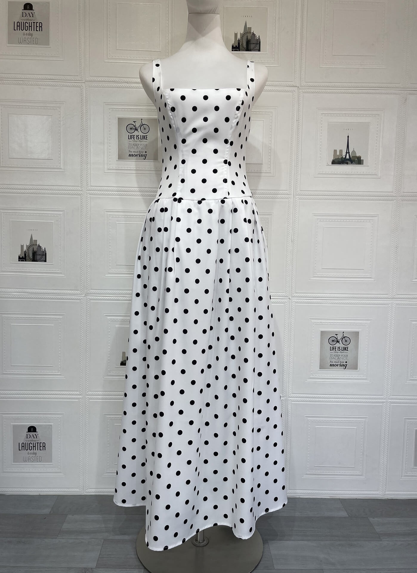 Madeleine Polka Dot Square Neck A-Line Maxi Dress is a stunning blend of timeless style and modern sophistication. Featuring a flattering square neckline and bold black polka dots on a white background, this dress is perfect for any semi-formal or casual occasion. The A-line silhouette offers a relaxed yet flattering fit, while the polka dot print adds a playful touch that makes it stand out in any crowd.