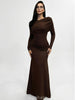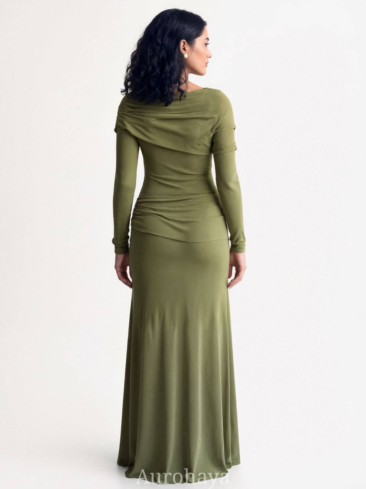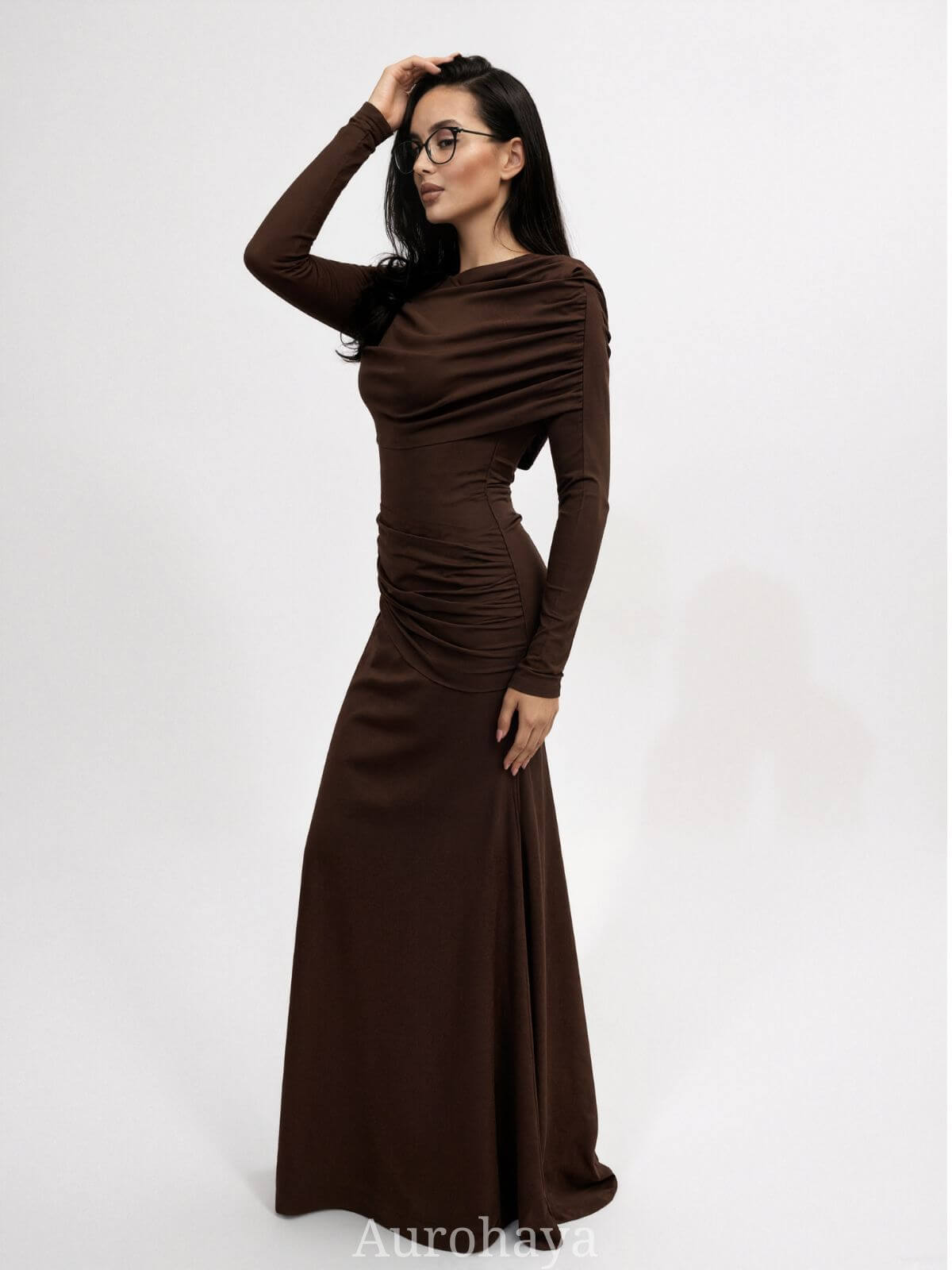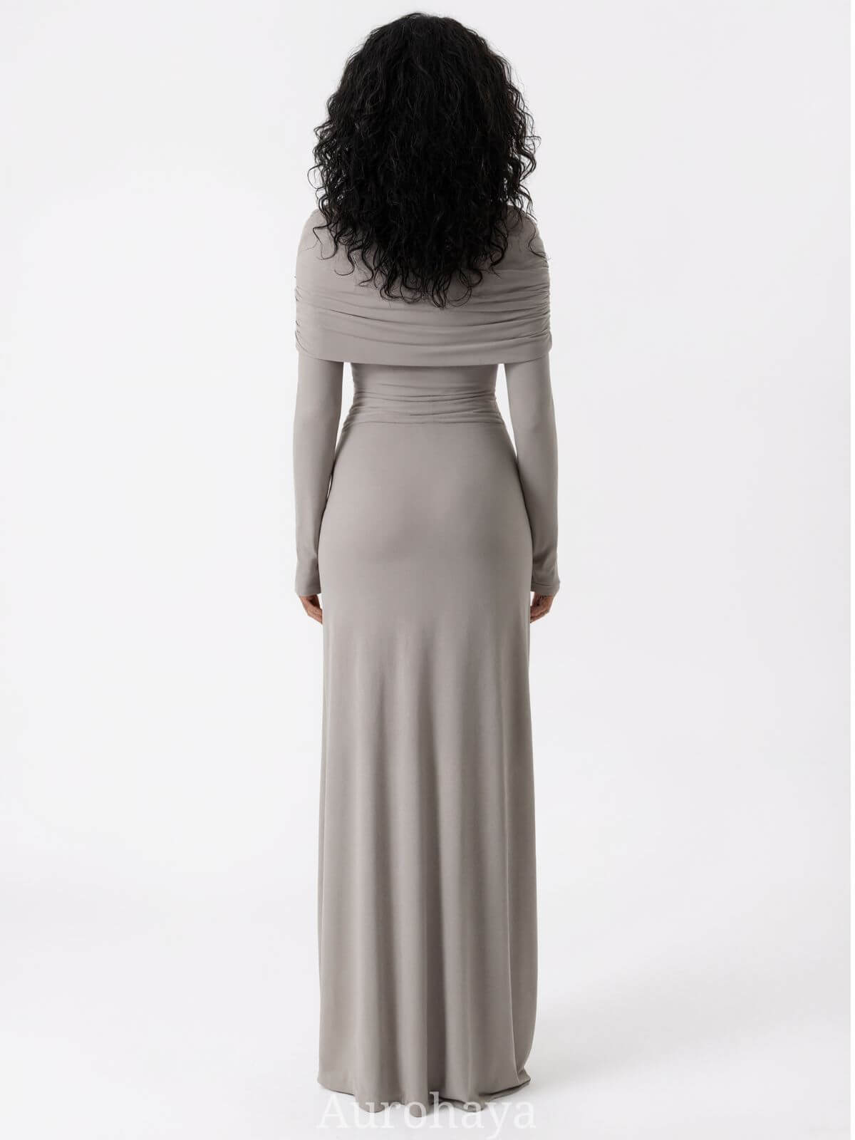Cut to a full maxi length, the dress creates a refined profile whether you style it with heels for formal occasions or boots for a daytime look. Ruched panels strategically smooth the waist and enhance natural curves without constraining movement. Long sleeves provide season-spanning versatility and modest coverage, while the round neckline keeps the overall look timeless and easy to accessorize.
