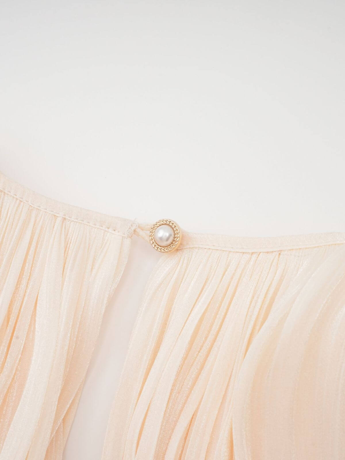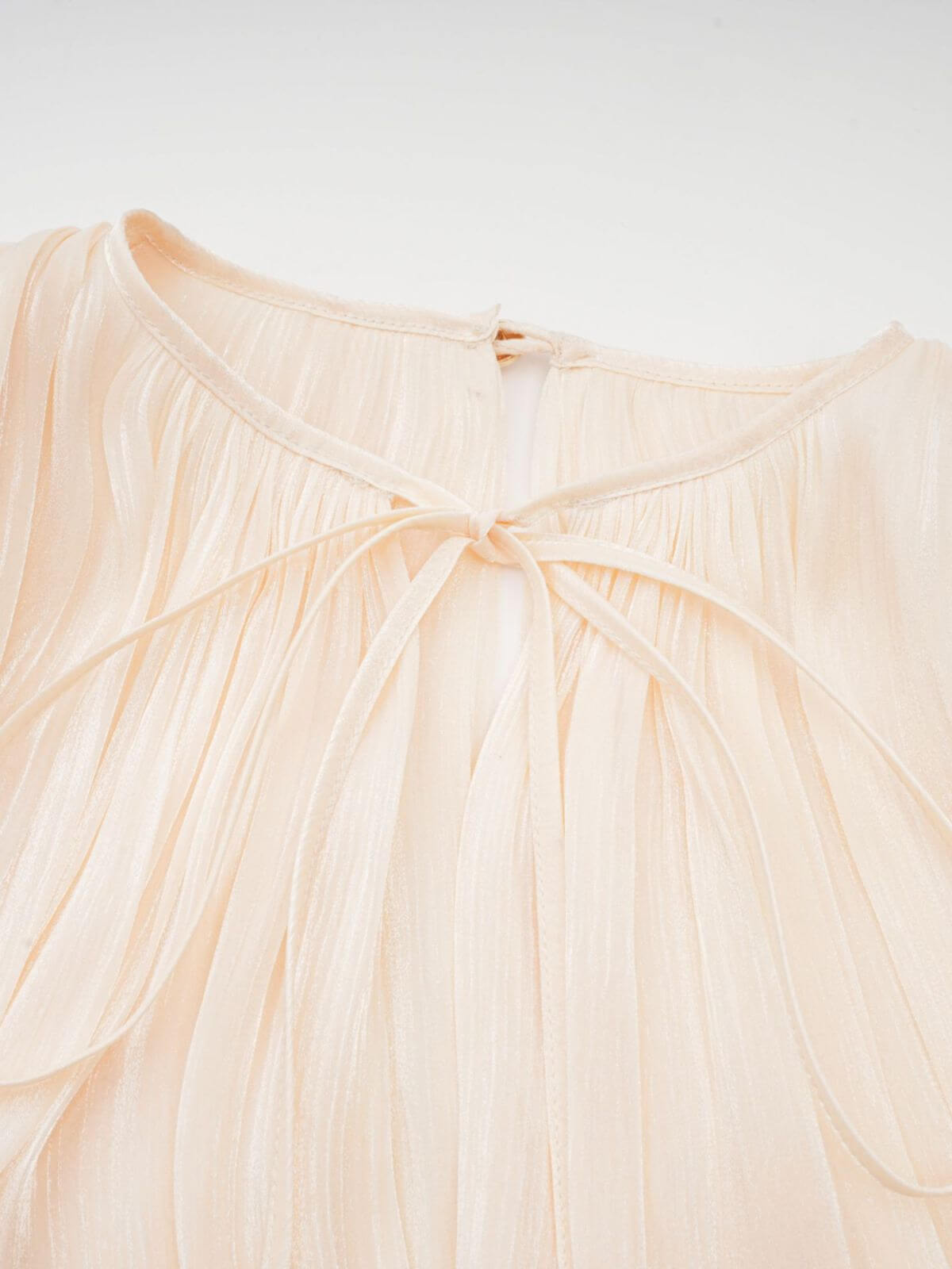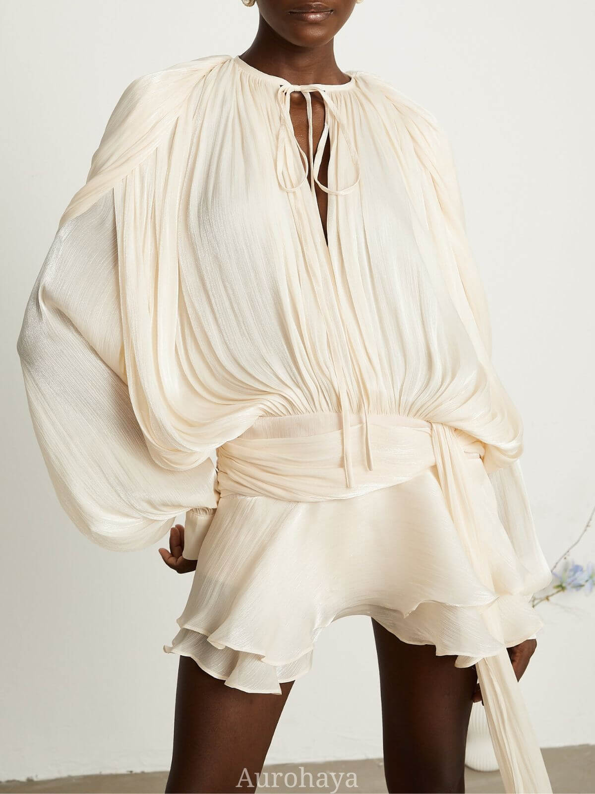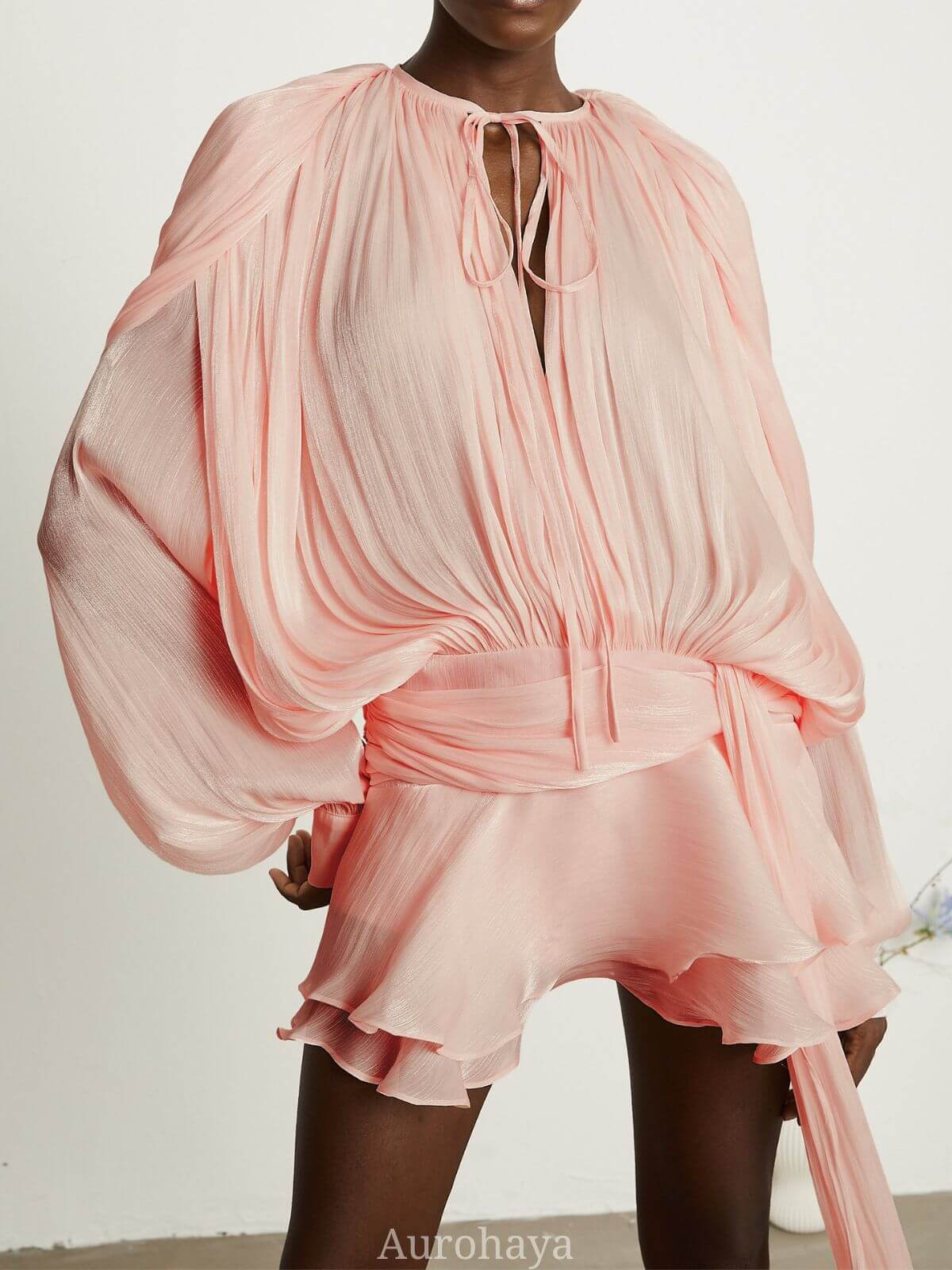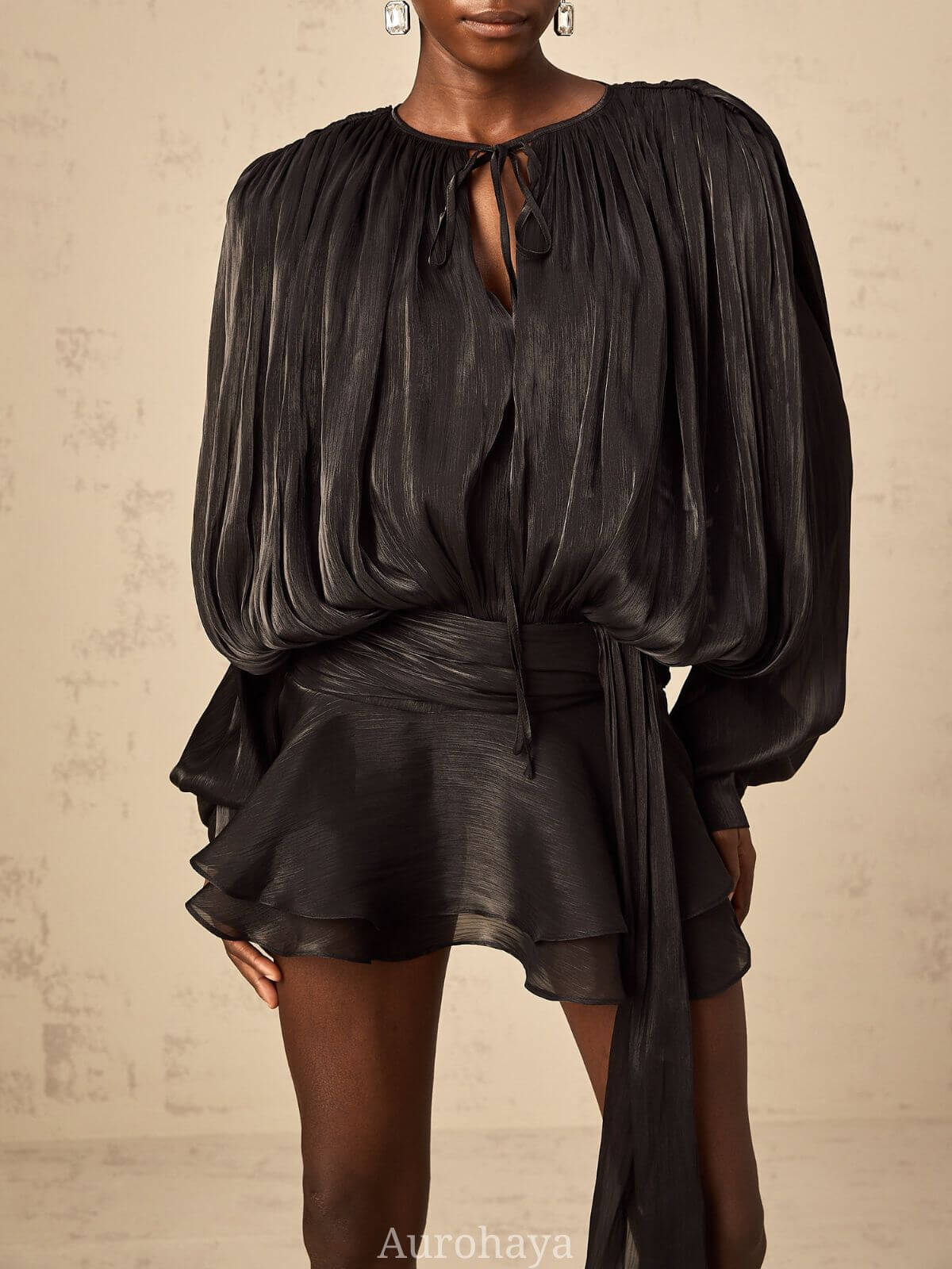 A show-stopping pleated ruffled mini dress featuring a fully pleated body, ruffled hem and long buttoned-cuff sleeves for an elegant, fashion-forward silhouette. This glitter-detailed, twist-front design includes shoulder pads and soft draped detailing that creates a flattering blouson waist. Neck tie fastening adds a feminine touch while practical rear button and side zip fastenings ensure a secure fit. Mini length and flowing ruffles make it ideal for cocktail parties, evening events, and stylish date nights.