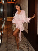 Blush draped mini dress with long semi-sheer puff sleeves — a pink party dress and cocktail-ready evening mini that combines romance with modern polish. Designed with a cinched, draped waistband to sculpt and elongate the silhouette, this lightweight, fluid fabric piece features a short layered skirt with airy ruffles and a delicate tie-neck for a refined finish. Comes with built-in matching shorts and full lining for confident coverage and easy movement.