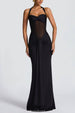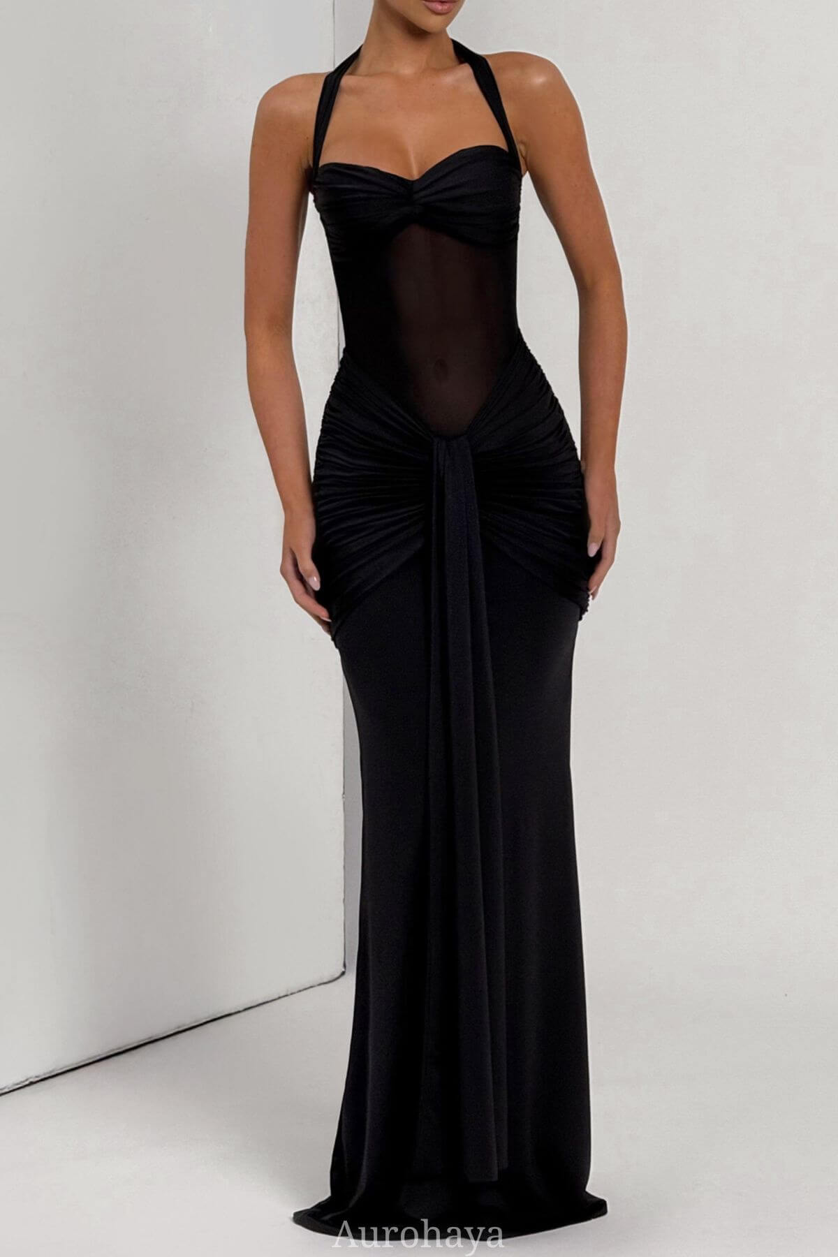 Halterneck, sleeveless and corset-style, the Sévara Halterneck Gathered Maxi Dress pairs a stretch slinky jersey skirt with a sheer mesh bodice and a sculpting sweetheart neckline for a striking evening silhouette. Self-tie straps and a fitted waistline lead into gathered detailing and a ruched hip panel with a delicate ribbon front tie — all designed to create a flattering, fit-and-flare look in maxi length. The stretch design and fully lined bust and skirt ensure comfort and a smooth finish for formal wear.