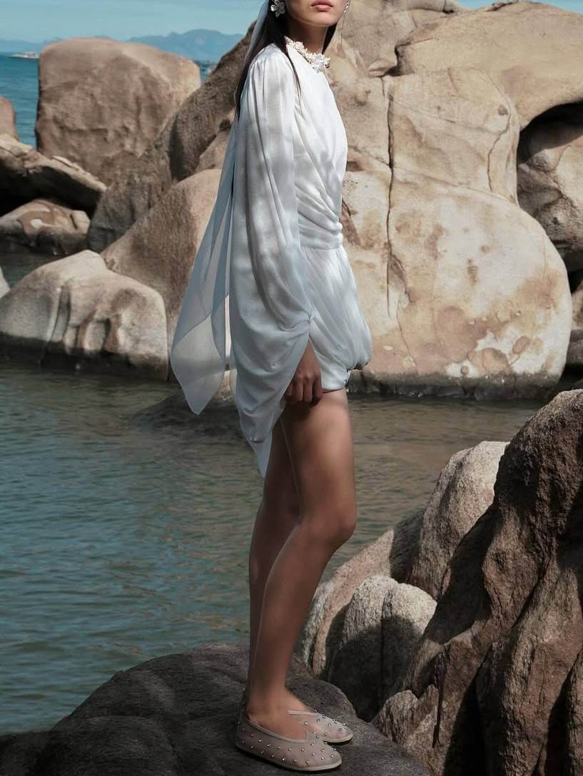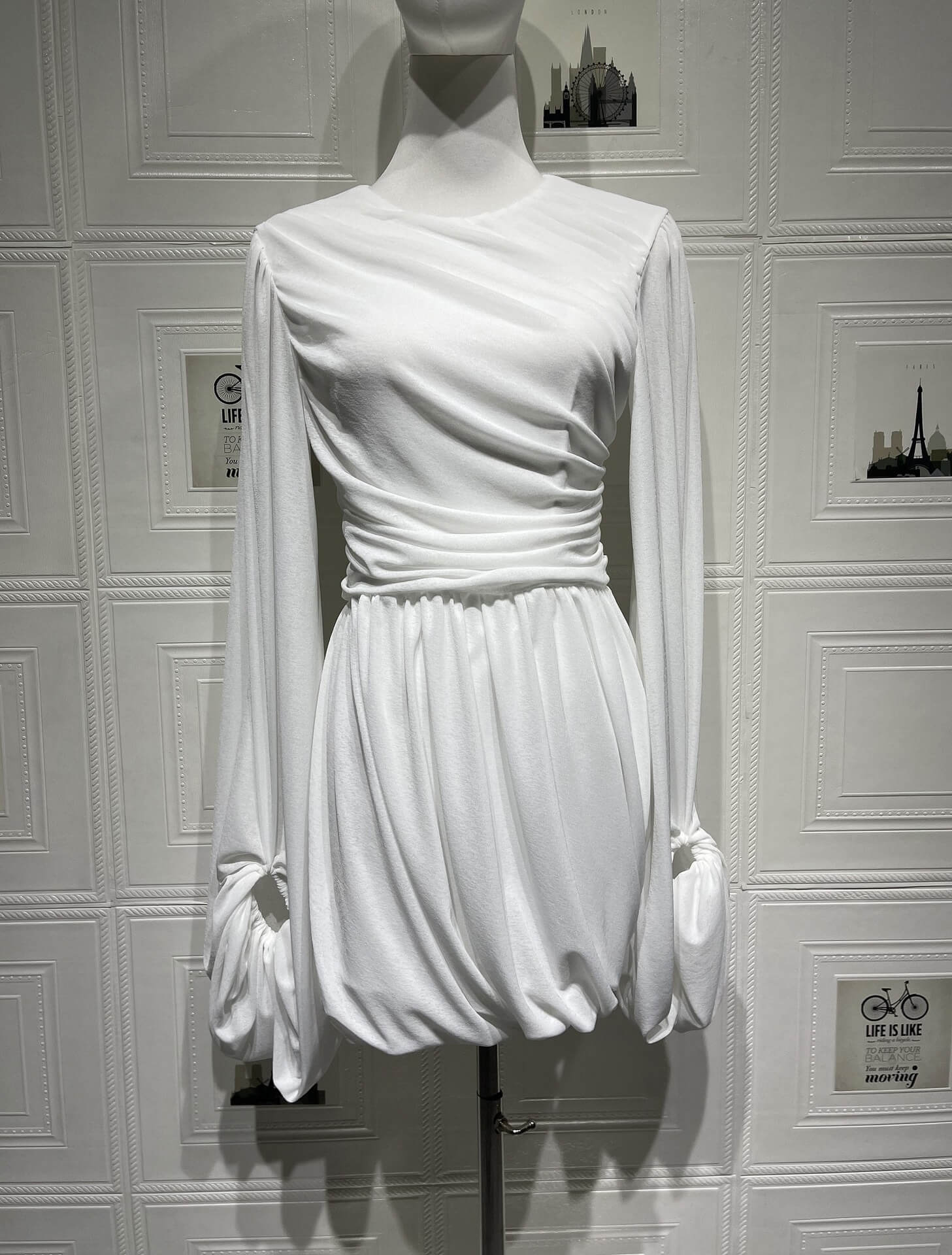Yvonne  Casual Pleated Mini Dress is a must-have wardrobe staple that blends sophistication with comfort. This elegant white mini dress features a flattering pleated design, which adds texture and shape to the silhouette. The long sleeves are finished with a unique detail, showcasing a chic, gathered effect at the cuffs, while the ruched waistline enhances your natural curves.