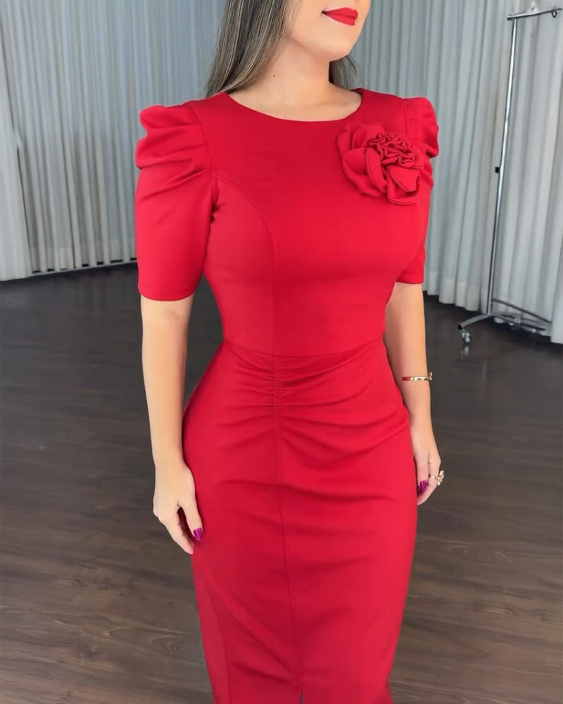 3D Flower Decor Round Neck Puff Sleeve Bodycon Dress Casual Ruched Slit Zipper Back Work Dress