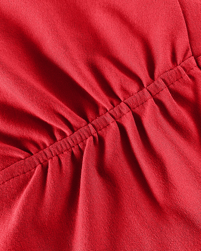 3. Design Details  Short puff sleeves, ruched waist, 3D floral embellishment, side slit, and back zipper add dimension, visual interest, and a feminine, modern touch.
