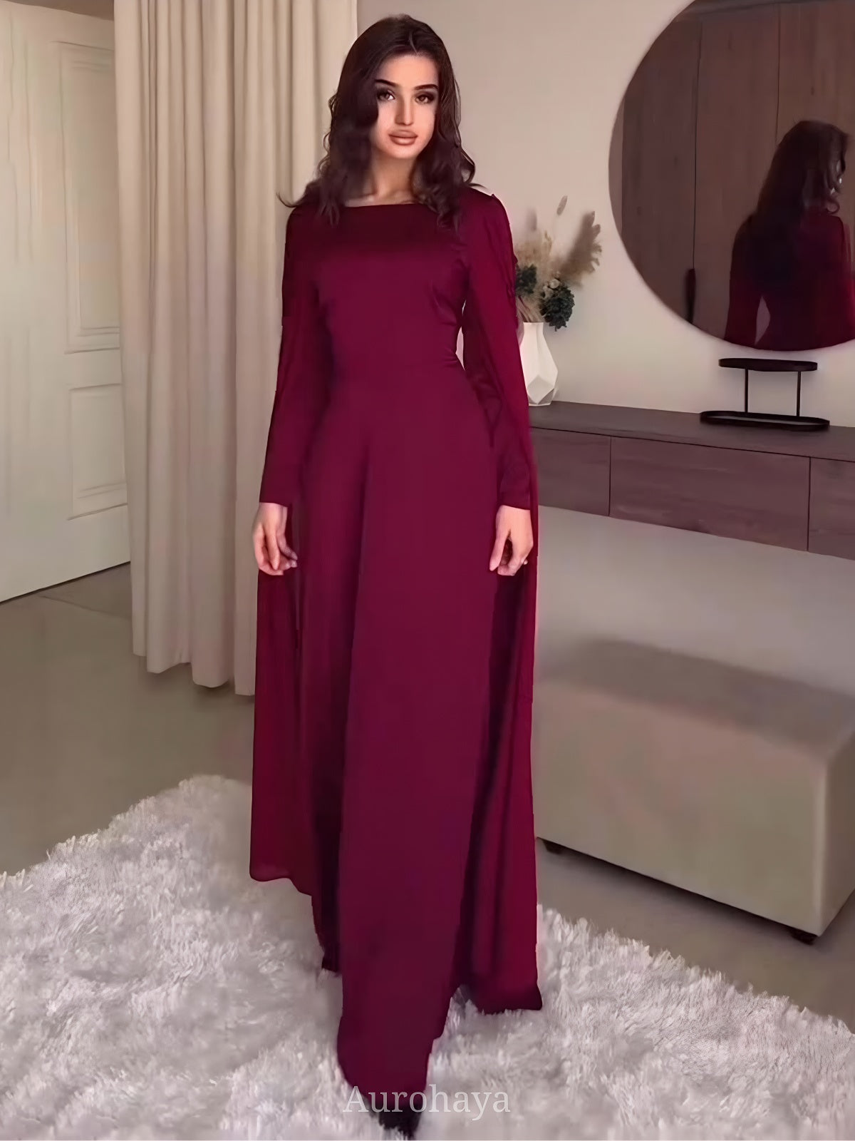 Burgundy modest maxi dress — cape sleeve evening gown with long sleeves and a floor-length, abaya-style silhouette. This elegant burgundy chiffon A-line dress features a soft square neckline and dramatic flowing cape sleeves for modest coverage and graceful movement. Ideal as a modest evening dress, wedding-guest gown, Eid or Ramadan outfit, formal party dress, or sophisticated everyday maxi for modest fashion lovers.