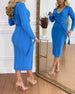 Cable Textured Overlap Deep V Neck Long Sleeve Mid Length Dress Tie Waist Slim Fit Knit Dress
