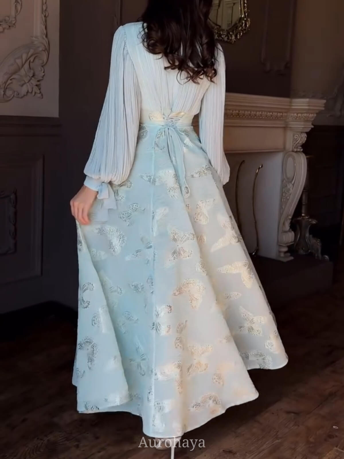 Drift through every event in our Chiffon Butterfly Pleated Maxi Dress. Featuring a delicate pleated chiffon bodice, ethereal bishop sleeves, and a sculpted high‑waist that segues into a flowing skirt dotted with metallic butterfly foil accents. Light, romantic, and made to flatter—perfect for weddings, galas, or any moment you want to shine.