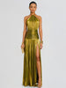 Elegant Metallic Pleated Halter Neck Maxi Dress