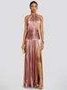 The flowing skirt is split to the thigh for a bold touch. Perfect for formal dinners, galas and red carpet events, this dress captures light and movement with every step.