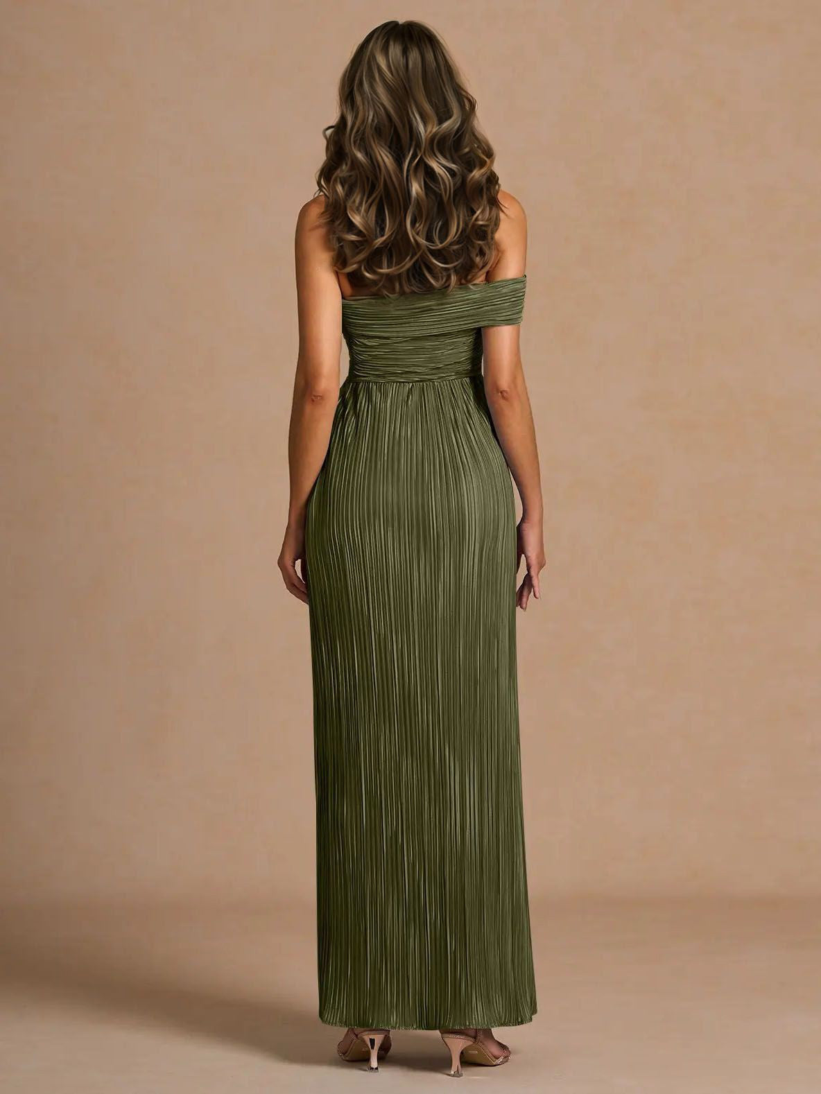 Elegant Off-The-Shoulder Pleated Slit Maxi Dress