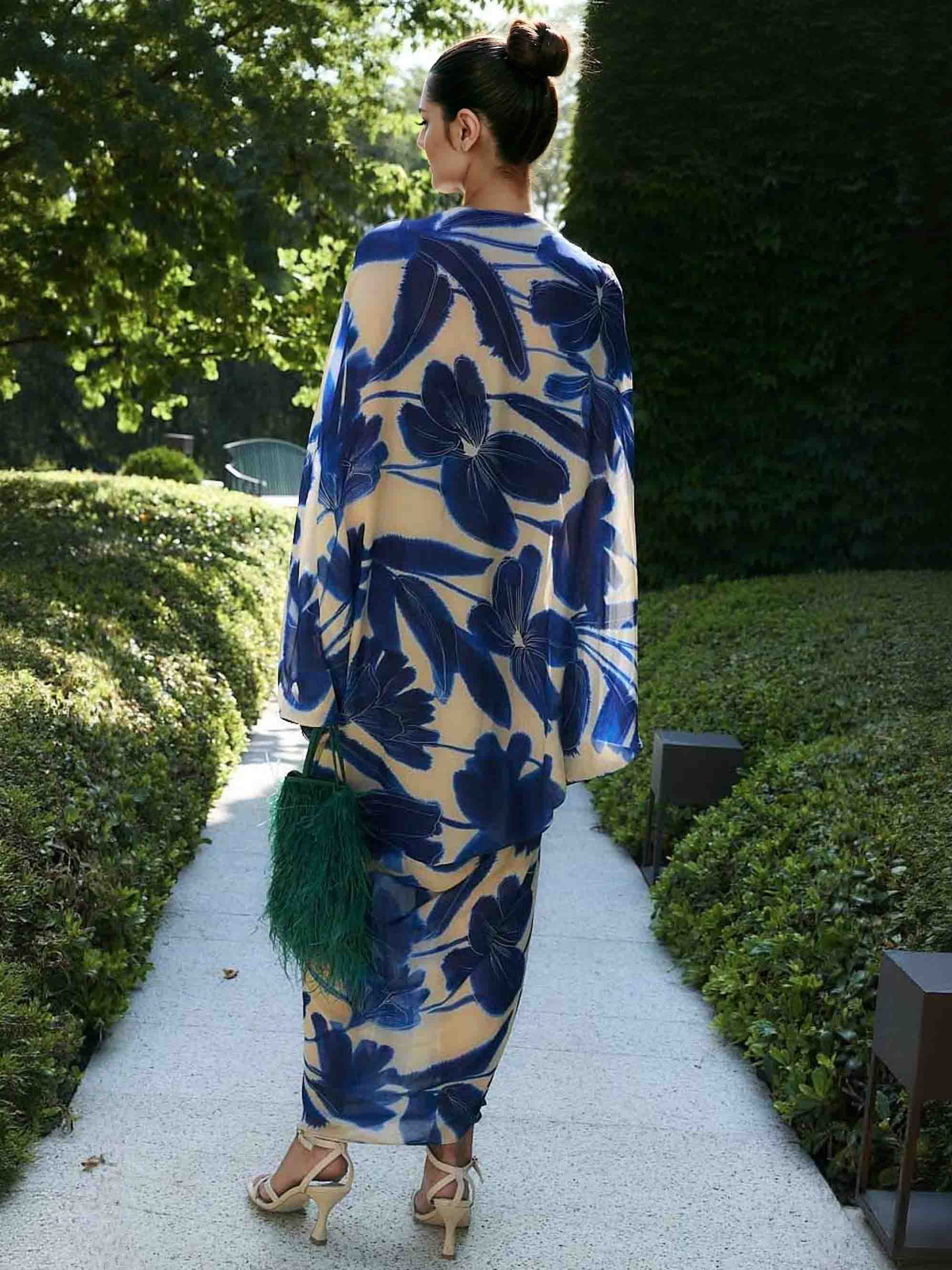 Make a statement with this elegant oversized floral print chiffon maxi dress. Designed with dramatic batwing sleeves and a flowing silhouette, it offers both comfort and sophistication. The airy chiffon fabric drapes beautifully, while the bold floral print adds a touch of artistic charm. Perfect for vacations, garden parties, or evening gatherings, this maxi dress blends effortless glamour with modern elegance.