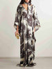 Crafted from smooth satin with a luxurious sheen, this maxi dress features a graceful feather print that adds a touch of sophistication and charm. The flowing batwing sleeves create a sense of effortless elegance, while the relaxed silhouette drapes beautifully with every movement. Perfect for evening occasions or stylish resort getaways, this dress embodies refined femininity and timeless allure.