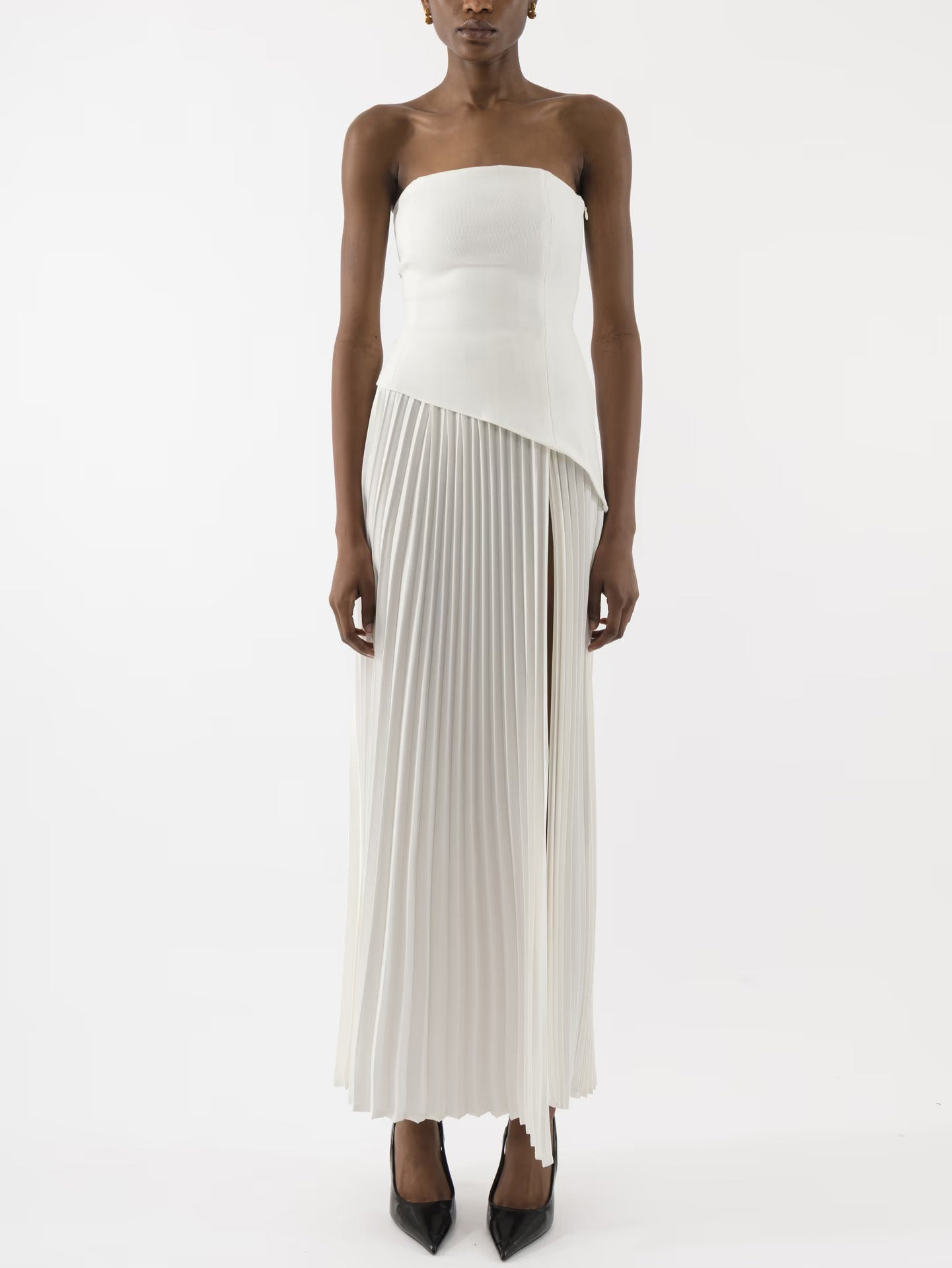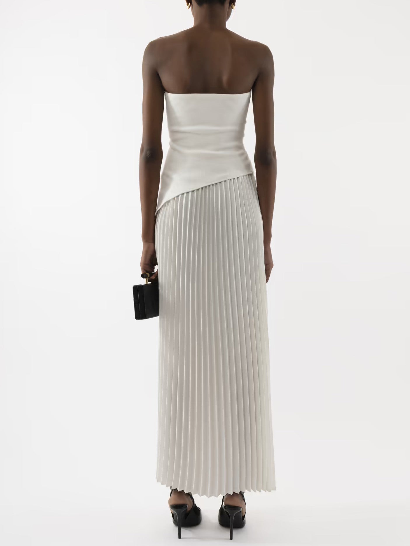 The delicate pleating and bold high slit create a perfect blend of sophistication and allure. The soft, flowing fabric enhances every movement, making it the perfect choice for formal occasions, evening parties, or special celebrations.