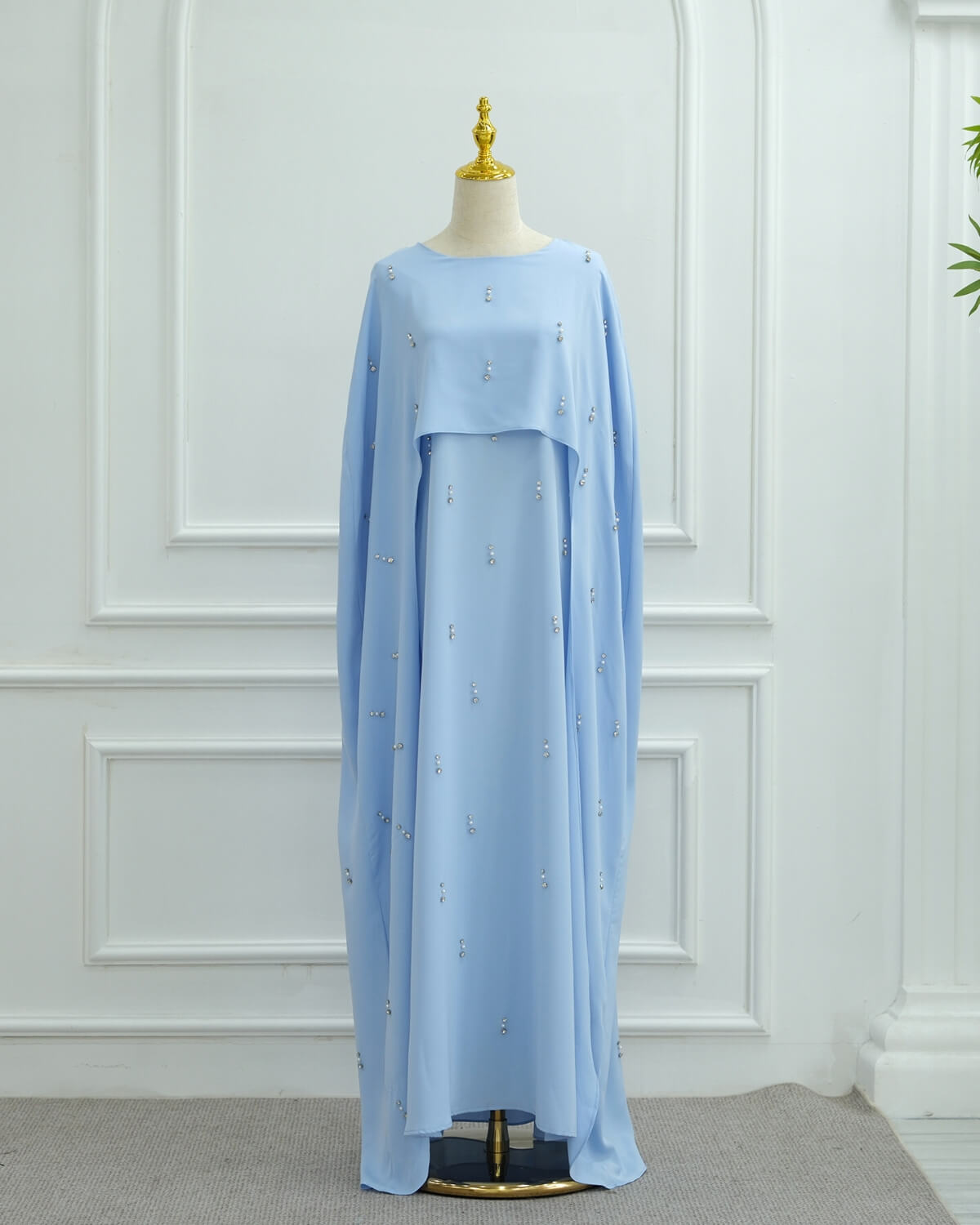 Experience timeless elegance in our Luxury Pearl & Diamond Maxi Cape Dress, a stunning modest gown designed for women who appreciate refined style. Handcrafted with premium fabrics and adorned with delicate pearl and diamond-style embellishments, this dress features a flowing maxi silhouette and a detachable cape for versatile looks. Available in soft pink, pastel blue, and mint green, it's the perfect choice for weddings, Eid, evening parties, and other special occasions.
