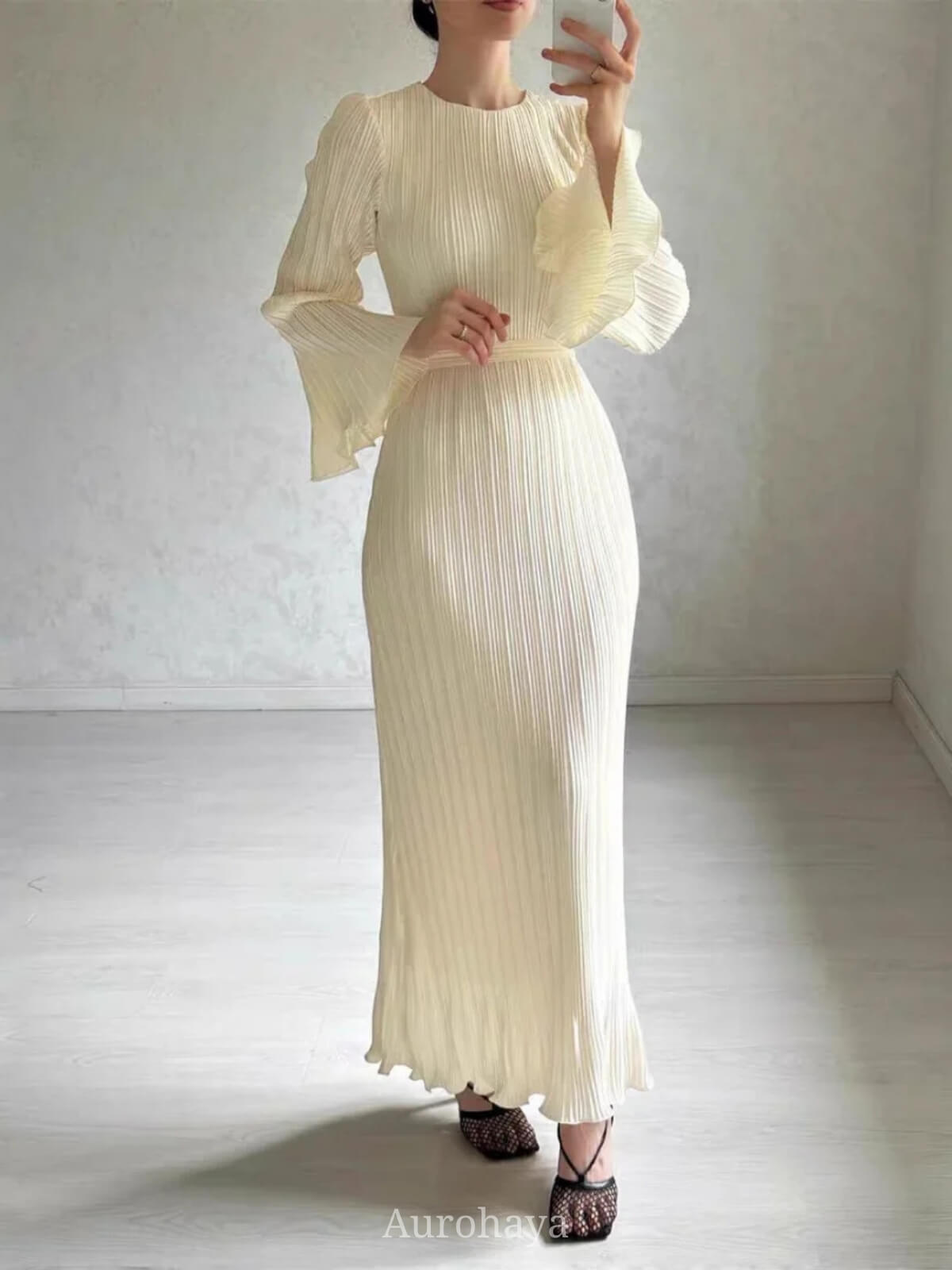 Pleated maxi dress — a modest long-sleeve maxi with bell cuffs and soft puff shoulders, crafted for hijab-friendly coverage and graceful movement. Fine vertical pleats create an elongating silhouette that skims the body into a fluid, ankle-length hem with a delicate wavy finish. The high crew neckline and long sleeves deliver confident coverage while the defined waist gives a feminine shape without sacrificing comfort.