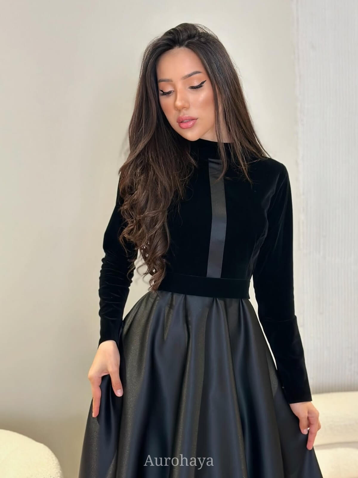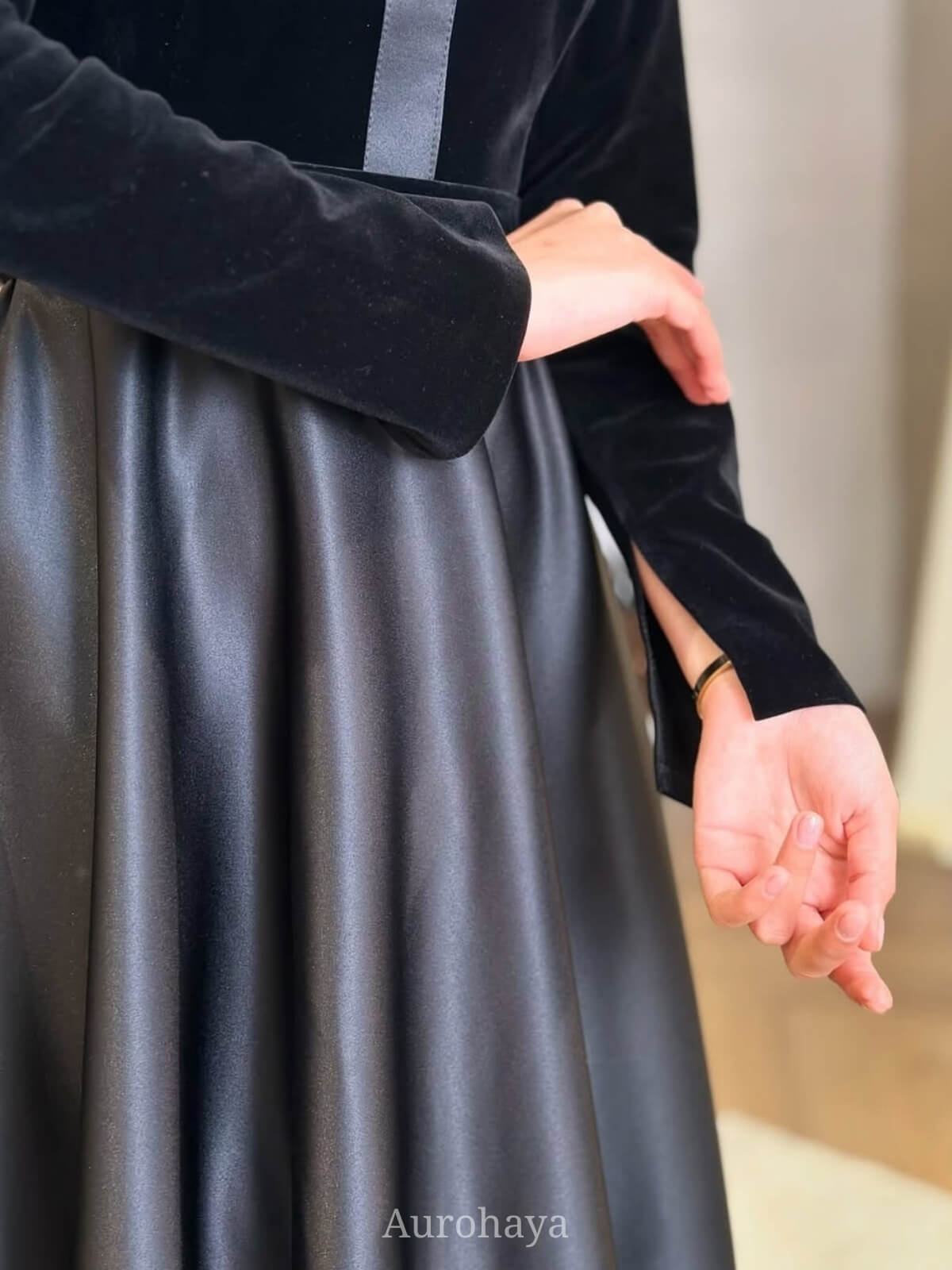 Crafted for formal occasions, the fitted velvet top features a refined high neckline and long sleeves for modest, graceful coverage. The contrasted satin skirt adds luminous sheen and fluid drape, creating a flattering A-line/maxi silhouette that skims the floor. Subtle seam detailing at the waist gives a corseted look without stiffness, offering structure with comfort.