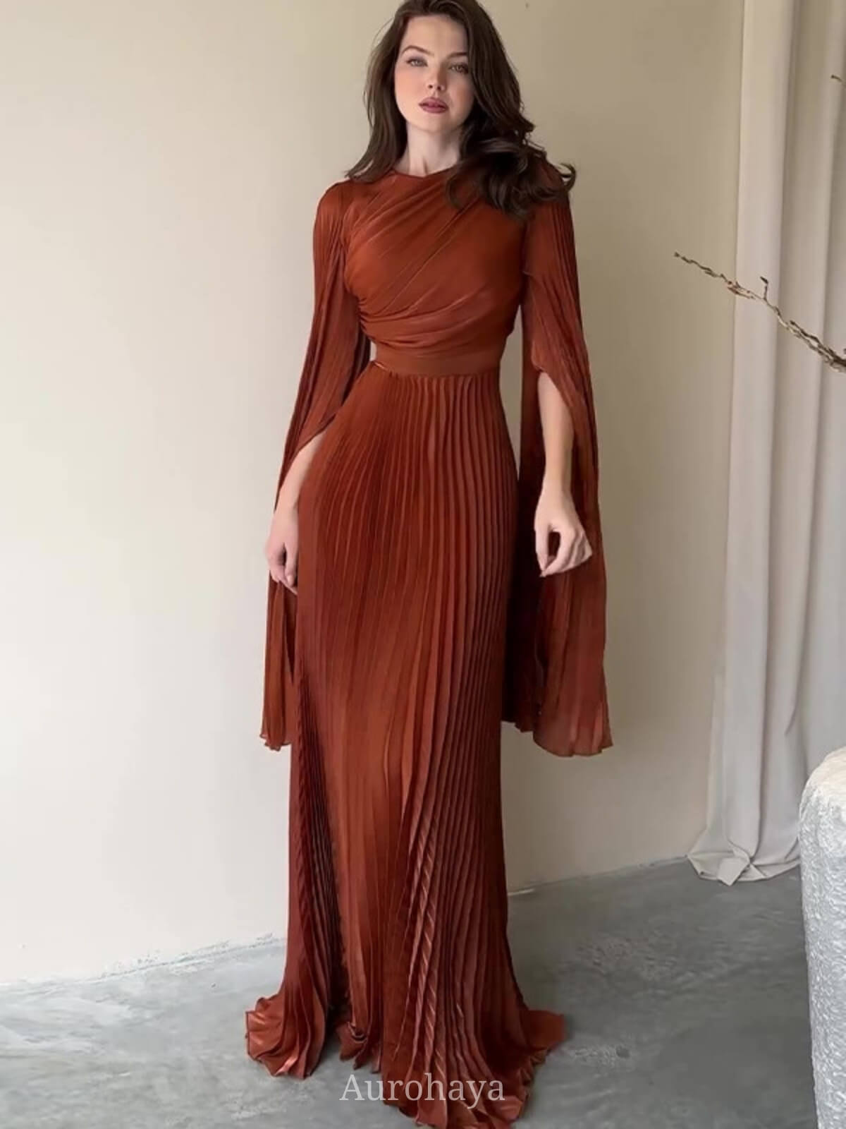 Split-sleeve, waist-cinching dress — a rust-copper pleated maxi that pairs dramatic split bell sleeves with a sculpted, cinched waist for a flattering, modest silhouette. This floor-length pleated evening gown features a draped wrap bodice, a defined waistband, and a flowing accordion-pleat skirt that moves beautifully with every step. Perfect as a wedding guest dress, formal evening gown, or elegant party maxi, it photographs and videos with refined, timeless appeal.