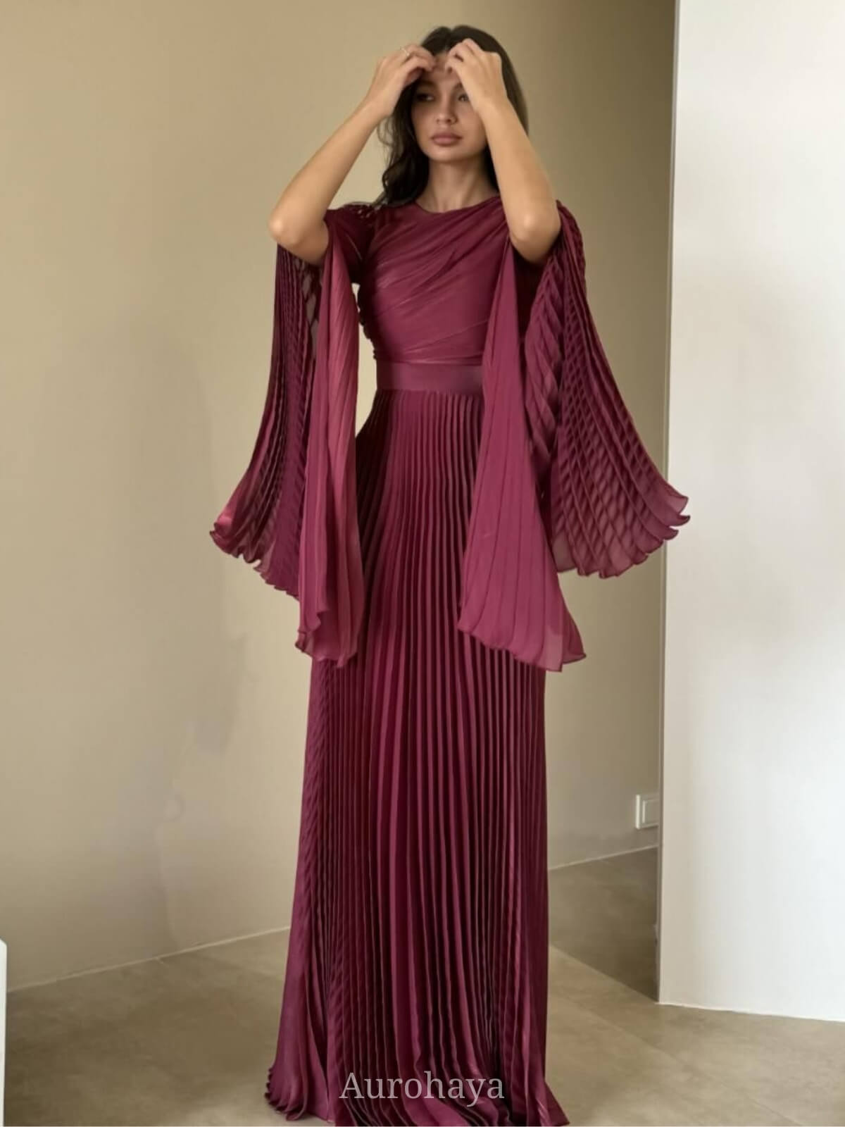 The long split (open) bell sleeves add graceful movement and instant drama, while high-definition pleats through the skirt deliver texture and volume without bulk. The tailored waist accentuates your shape yet remains comfortable—ideal for those seeking a modest look that still reads fashion-forward. Breathable, lightweight fabric drapes naturally, keeping the silhouette elegant and wearable for long events.