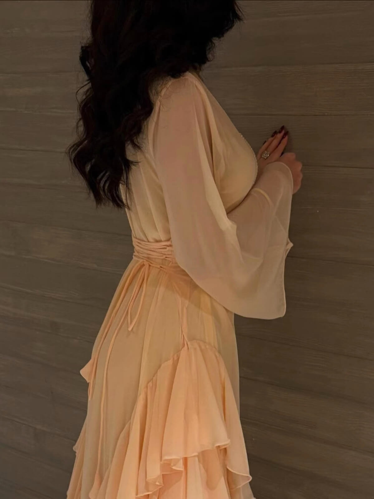 Square neck ruffle long sleeve dress — an elegant waist-cinched maxi designed to flatter the figure while maintaining timeless sophistication. This long sleeve maxi dress features a feminine square neckline, delicate ruffle trim, and a fitted waistline that enhances natural curves with effortless grace. Crafted from lightweight fabric, it flows into a refined A-line skirt, perfect for creating a polished and modern silhouette.